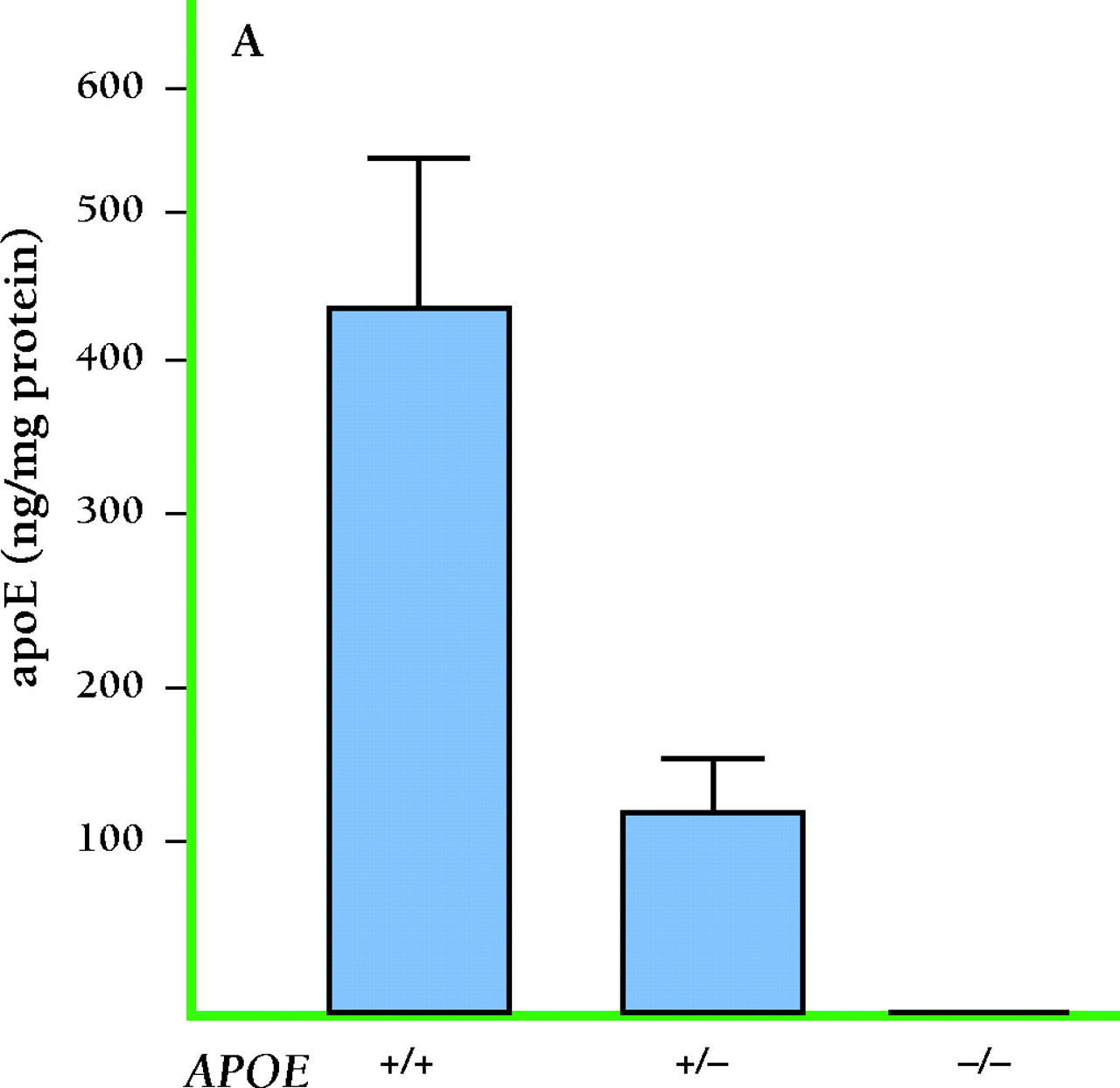 Expression of apoE and its association with Aβ deposits in transgenic mice. A. Levels of apoE in APPV717F transgenic brain homogenates correspond to Apoe gene dosage. B. Staining for apoE (green) and Aβ (red) shows that apoE colocalizes with most Aβ -immunoreactive deposits (bottom panel). Adapted from (47).