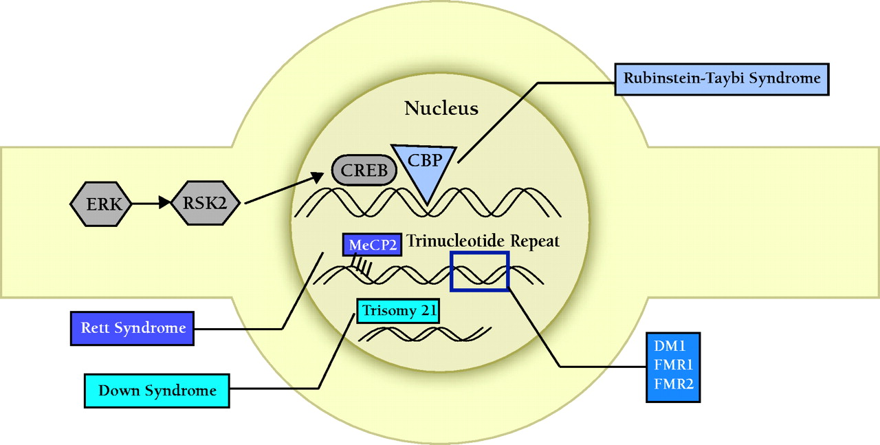 Nuclear function in cognitive disorder. Consolidation of long-term memory requires the regulation of gene expression. Active Rsk2 phosphorylates the transcription factor, CREB. P-CREB recruits the coactivator CREB binding protein (CBP) and promotes transcription of genes whose promoters contain CRE sites. MeCP2 permanently represses expression of some genes that are methylated in CpG islands found in the promoters. Loss of MeCP2 causes an aberrant increase in the dosage of some genes, usually genes that undergo imprinting. Expansion of trinucleotide repeat sequences in genes changes local chromatin structure and influences RNA metabolism, leading to the dysregulation of several genes. Presence of an extra chromsome (trisomy) results in pathological over-expression of potentially hundreds of genes.