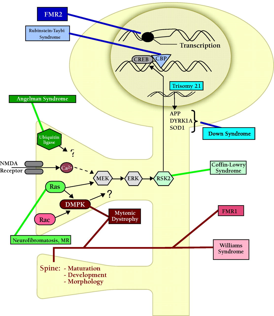 Disruptions along the molecular cascade for memory formation lead to cognitive disorder. Memory formation begins with activation of signaling pathways at the membrane of dendritic spines. The signaling cascade reaches the nucleus, where the activity of transcription factors is modulated, resulting in changes in gene expression. Newly synthesized proteins cause long-term changes in cell function, such as the growth and maturation of new dendritic spines.