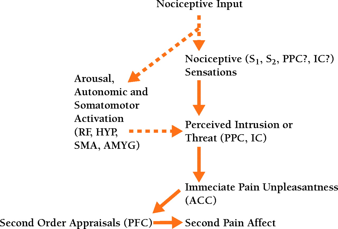 Interactions between pain sensation, pain unpleasantness, and secondary pain-affect. Interactions are illustrated by arrows. Neural structures likely to have a role in these dimensions are shown. Dashed arrows indicate nociceptive or endogenous physiological factors that influence pain sensation and unpleasantness. ACC, anterior cingulate cortex; PCC, posterior cingulate cortex; IC, insular cortex; HYP, hypothalamus; S1 and S2 , first and second somatosensory cortical areas; PPC, posterior parietal complex; SMA, supplementary motor area; AMYG, amygdala; PFC, prefrontal cortex; RF, reticular formation.