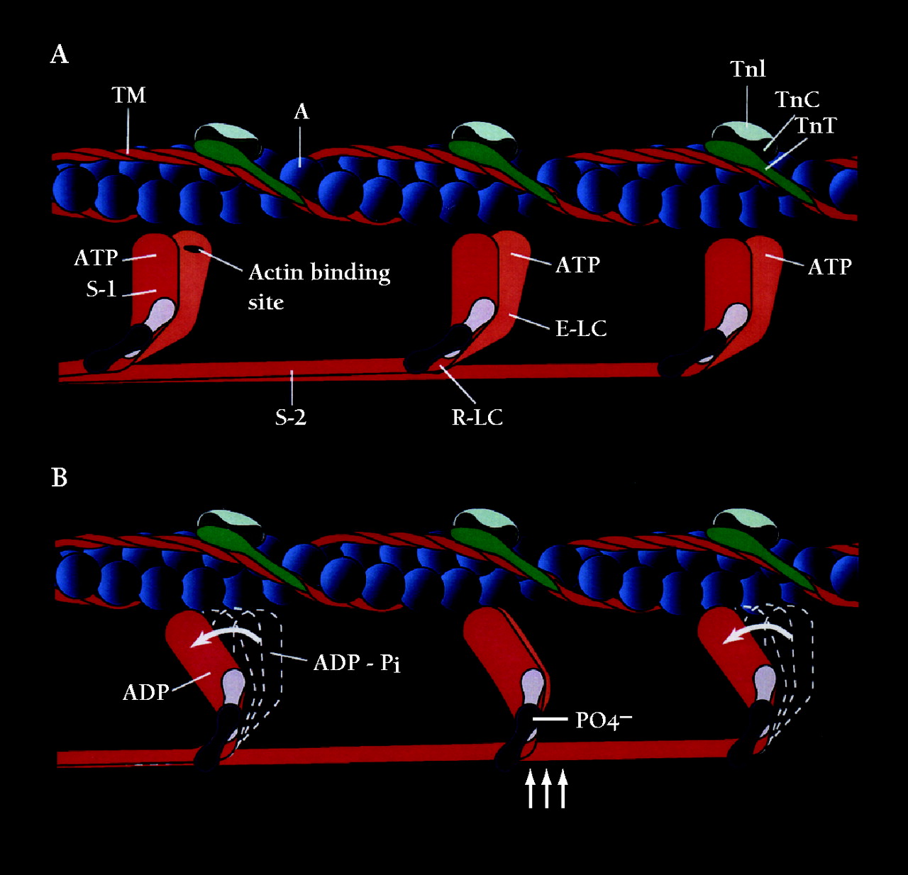 Schematic representation of the contractile and regulatory proteins of the thick and thin filaments of the cardiac sarcomare. A. The actin monomers (A) of the thin filament (blue spheres) and the cable-like tropomysin (TM) molecule (red), as well as the regulatory protein complex consisting of troponin I(TNA)(light blue), troponin C(TNC)(dark green) are shown. The S-I or motor head domain of myosin (red and orange), including the essential light chain (E-LC) (light purple) and the regulatory light chain (R-LC) (purple), is also depicted. S-2, part of the tail domain, oors S-1 to the thick filament.B. The movement of S-1 towards the thin filament proposed to occur following phosphate incorporation(PO4−) by the R-LC is shown(vertical arrows). The force-generating power stroke is energized by the hydrolysis of ATP to its products ADP = P,iand the subsequent release of Pi(curved arrows). Phosphate incorporation by the R-LC may facilitate this force generating event during submaximal Ca2+activation.