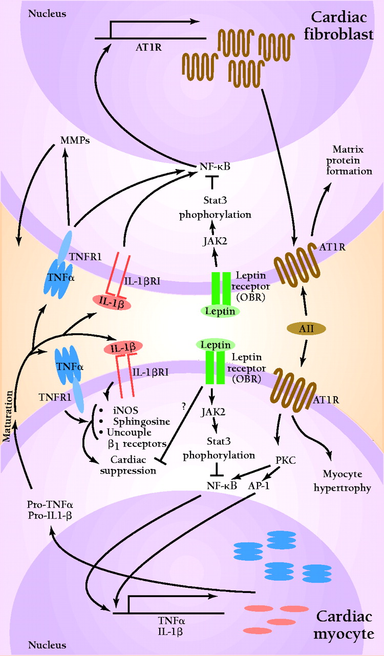 Angiotensin II (AII), acting through angiotensin II type I receptors (AT1R), promotes cardiac myocyte hypertrophy and cardiac fibroblast matrix formation. Activation of AT1R signals the nucleus via protein kinase C (PKC), nuclear factor κB (NF-κB), and activator protein 1-(AP-1)-dependent pathways to increase transcription of tumor necrosis factor-α (TNF-α) and interleukin-1β (IL-1β). Following protein processing, mature TNF-α and IL-1β are secreted and can act in an autocrine or paracrine fashion to activate their respective receptors. In the cardiac fibroblast, TNFR1 and IL1βR1 activation results in increased activity of matrix metalloproteinases (MMP). Additionally, activation of NF-κB can lead to increased AT1R production. In cardiac myocytes, these cytokines bring about a multifaceted suppression of cardiac function by activating nitric oxide synthase (iNOS), increasing sphingosine production, and uncoupling β1-adrenergic receptors. Leptin, by binding to its receptor (OBR), can activate Janus kinase 2 (JAK2). This results in phosphorylation of signal transducer and activator of transcription (STAT3), which can alter the ability of NF-κB to activate gene transcription. These, as well as other possible leptin-induced processes, have the potential to disrupt AII-cytokine pathways, thus modulating cytokine-induced cardiac suppression.
