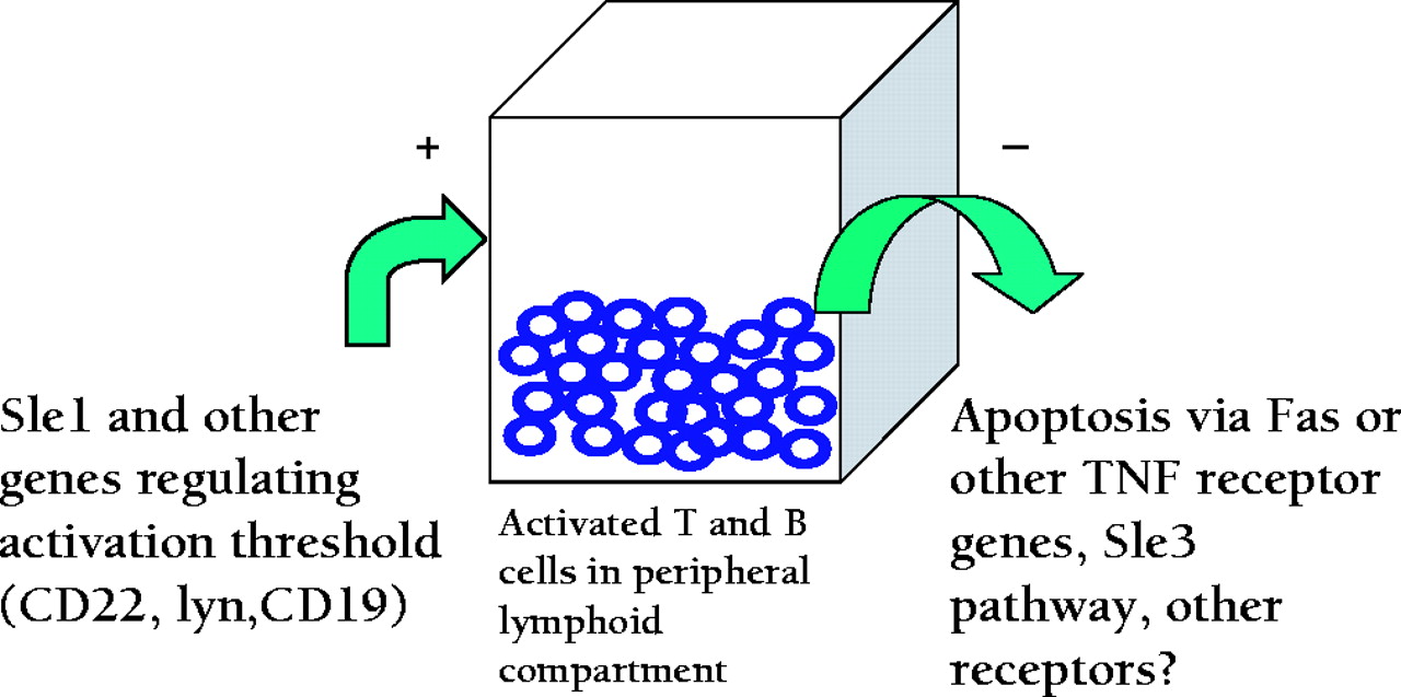 Regulating activated peripheral T and B cells bySle1 and possibly other genes. The size of this compartment is also controlled by activation-induced cell death (AICD) through Fas, wild-type Sle3, or other apoptosis-mediating receptors. Factors favoring the accumulation of cells (designated “+”) lead to the entry of additional cells into the lymphoid pool (left arrow). Those genes promoting reduction in cell numbers (designated “–”) result in a smaller pool (right arrow).