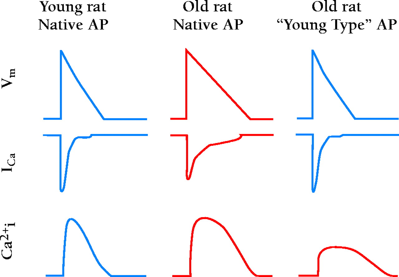 Schematic representation of the role of age-dependent action potential (AP) prolongation on intracellular Ca2+(Ca2+i) regulation in rat ventricular myocytes. Compared to young rats (4–6 months, left) old rats (23–24 months, middle) display a similar amplitude of the Ca2+i transient triggered by a markedly prolonged AP. Relative to stimulation with their long, native AP, stimulation of old rat ventricular myocytes with a short, “young type” AP (right) increases the amplitude of L-type Ca2+ current (ICa ) but reduces its time integral and diminishes the amplitude and rate of relaxation of the Ca2+i transient. Thus, it appears that ventricular myocytes of old rats utilize AP prolongation to sustain youthful Ca2+i regulation. From (11) .