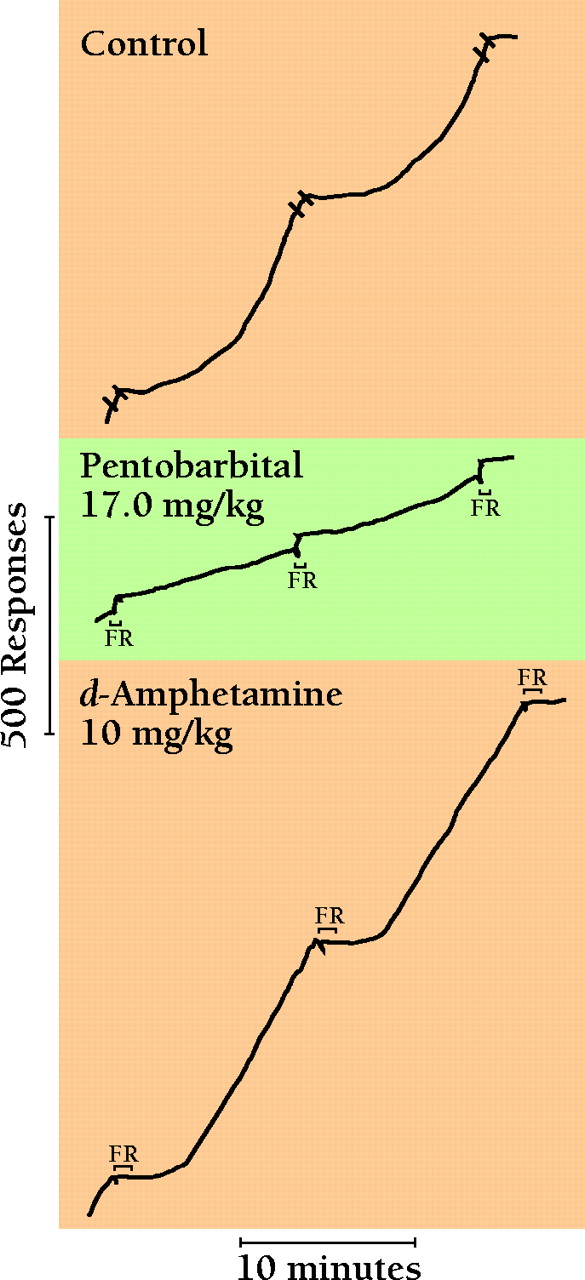 Effects of drugs depend on past experience (i.e., conditioned schedules of reward) and ongoing behavior. Effects of pentobarbital and amphetamine under a multiple fixed-interval (FI; 10 min) fixed-ratio (FR; 31 pecks) response schedule of reinforcement. Administration of pentobarbital decreases response (i.e., pecking) rates under the FI schedule without affecting response rates under the FR schedule. Amphetamine produces just the opposite: response rates under the FI schedule increase while the response rate under the FR schedule becomes negligible (shown by the bracketed areas). From (2) .