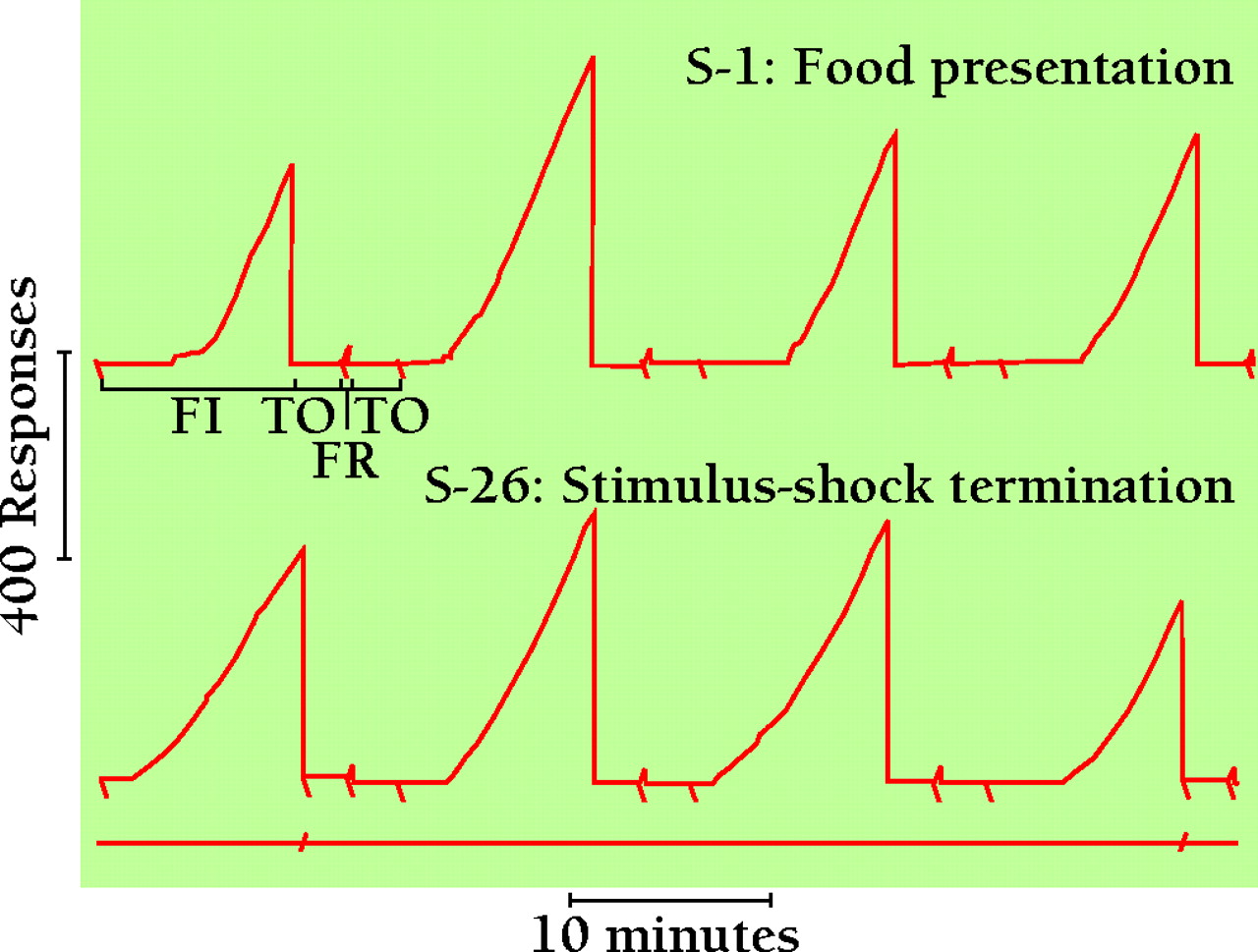 The preeminence of schedule over reward system in affecting behavior. Behavioral performances of squirrel monkeys maintained under reward by food presentation (S1) or by the termination of a stimulus correlated with the delivery of electric shock (S26). The schedules were FI and FR, as in Figures 1 and 2, with each experimental session beginning with the FI component; the FR schedule is shown by the smaller spikes in the cumulative record and alternates with the FI schedules. Note that the performances maintained by the different events do not differ, nor do the effects of chlorpromazine or amphetamine under these schedules (see text), indicating that the type of reinforcer and the presumed underlying emotional state correlated with these events do not influence the qualitative effects of the drugs. (TO, time-out). From (15) .