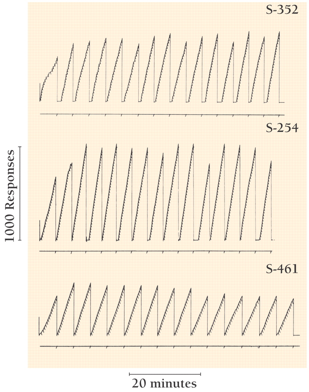 Maintenance of drug-seeking behavior by a second-order schedule. Performances of squirrel monkeys under a second-order schedule in which the first 30-response FR completed after 5 min produces an intravenous injection of cocaine; the completion of each 30 responses also produces a brief visual stimulus (indicated by the many diagonal slashes on the three traces) that, following the 5-min FI, result in a brief stimulus plus administration of cocaine. The recording pen returns to baseline upon cocaine administration. Note that exceptionally high response rates were maintained under this second-order schedule. From (29) .