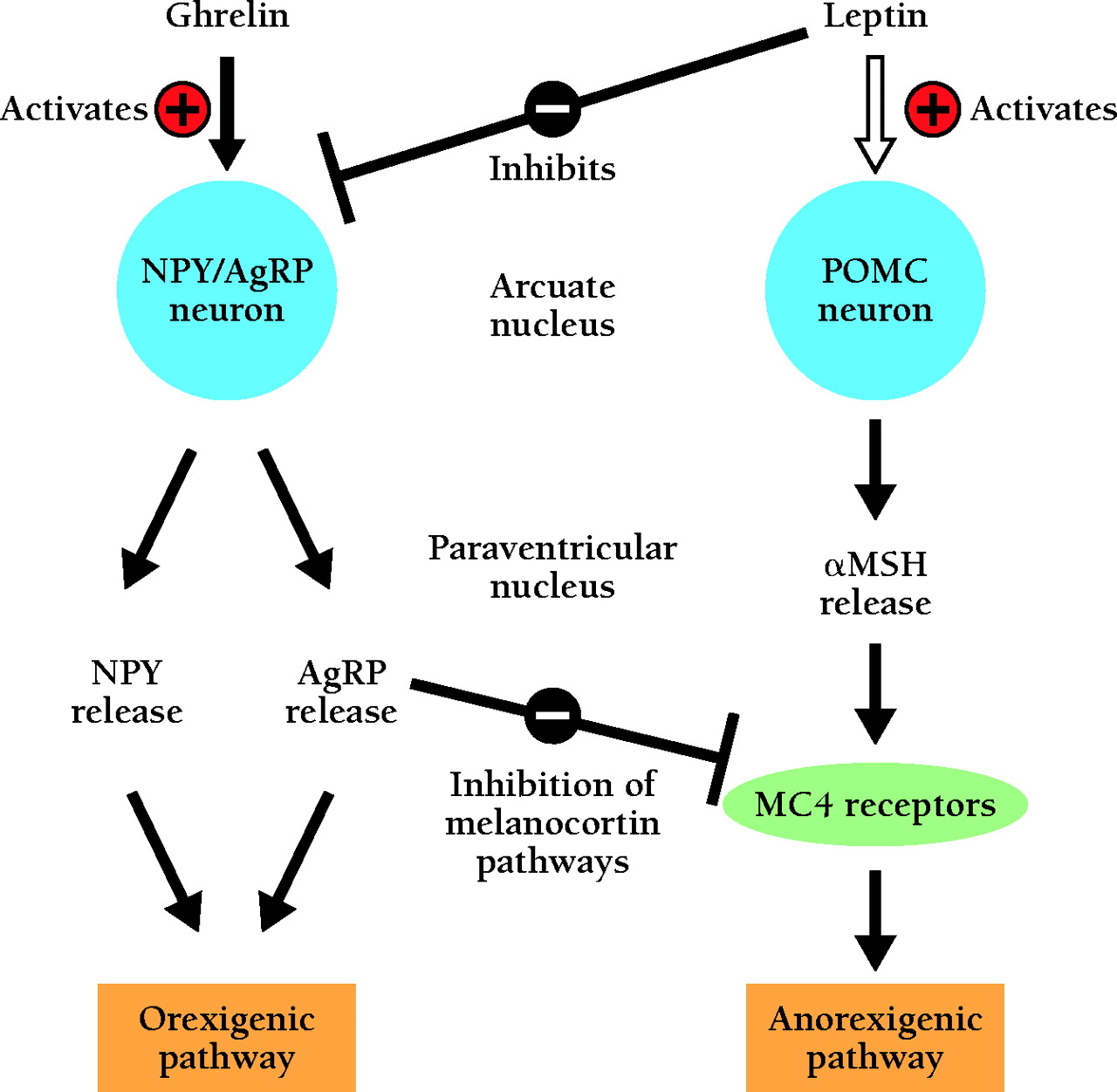 A simplified model of the feeding-regulatory signaling of ghrelin and leptin. Leptin stimulates the POMC anorexigenic pathway and inhibits the NPY–AGRP orexigenic pathway, resulting in reduced food intake. The effect of ghrelin in the hypothalamus is opposite to that of leptin. The orexigenic effect of ghrelin is mediated by activating on the output of the NPY–AGRP neurons. Fasting increases ghrelin and decreases leptin production, leading to the activation of the orexigenic pathway. This response might be important for the adaptation to fasting.