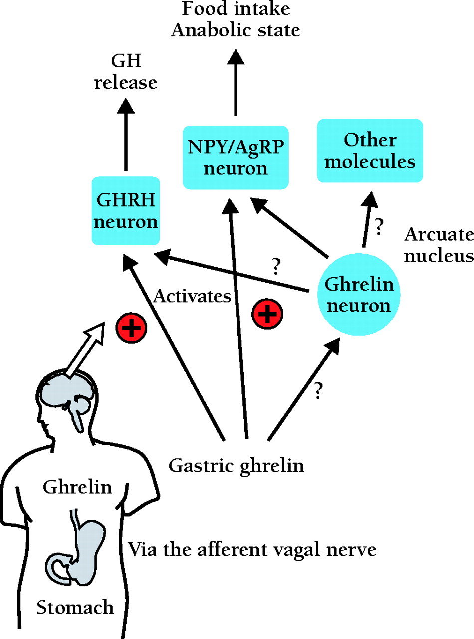 The orexigenic and somatotrophic effect of peripheral ghrelin mediated by the afferent vagal nerve . Circulating ghrelin acts on the stimulation of feeding and secretion of GH through the gastric vagal afferent nerves, and through the surgical deafferentation of them blocked GH secretion and food intake induced by peripheral administration of ghrelin. Although ghrelin is also produced by hypothalamic cells, it is unclear whether this source of ghrelin acts in a similar fashion to ghrelin produced by the stomach.