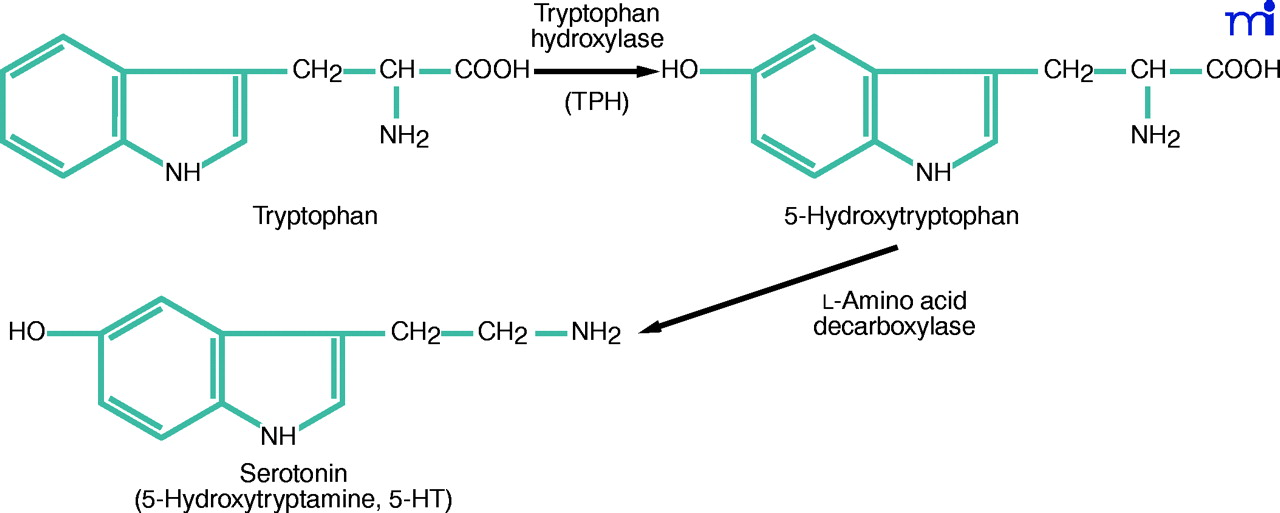 The tryptophan to serotonin two-step. The synthesis of serotonin from trytophan requires two enzymatic reactions. The first catalytic step involving the hydroxylation