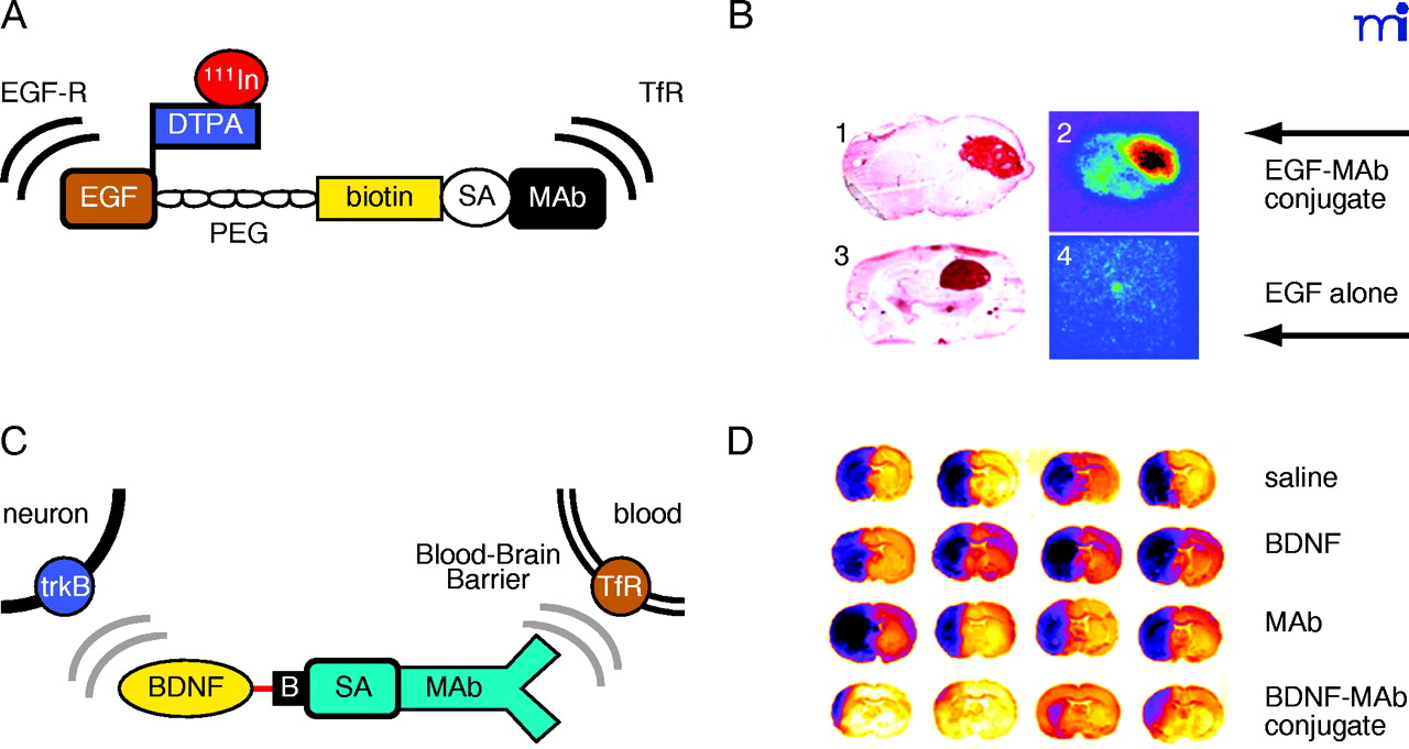 Delivery of protein therapeutics to the brain. A. Structure of an epidermal growth factor (EGF) chimeric peptide formed by conjugating the EGF to a molecular Trojan horse consisting of a monoclonal antibody (MAb) to the BBB transferrin receptor (TfR). See text for details. Thus, the EGF chimeric peptide is a bifunctional molecule that binds to the BBB TfR to allow for transport across the BBB, and to the EGF receptor (EGF-R) to allow for sequestration on the brain cancer cell membrane. Reprinted with permission (42). B. Panels 1 and 3 are autopsy sections of nude-rat brain bearing human U87 gliomas and stained with a MAb that binds the human EGF-R. The size of the tumor is visualized with the immunocytochemistry. Panels 2 and 4 are brain scans of the same rats as shown in Panels 1 and 3, but prior to sacrifice. The live nude rats bearing intracranial U87 human gliomas were administered intravenously either [111In]-EGF alone (Panel 4) or the [111In]-EGF-MAb chimeric peptide (Panel 2), indicating that EGF alone does not cross the BBB (Panel 4). However, the tumor is visualized with EGF chimeric peptide owing to transport of the EGF chimeric peptide across the BBB in the tumor (Panel 2). Reprinted with permission (42). C. Structure of a chimeric peptide of brain derived neurotrophic factor (BDNF) that is conjugated to a TfR MAb through an SA–biotin (B) linkage. The BDNF chimeric peptide is a bifunctional molecule that can bind both the BBB TfR to allow for transport from blood to brain, and the neuronal trkB receptor to allow for neuroprotection in brain. Reprinted with permission (47). D. Coronal sections of rat brain stained with 2,3,5-triphenyltetrazolium chloride (TTC). Coronal sections are shown for four different rats in four different treatment groups including saline, BDNF alone, TfRMAb alone, or the BDNF–TfR MAb chimeric peptide. The BDNF was administered at a dose of 50 μg/rat intravenously following permanent occlusion of the middle cerebral artery. The coronal slabs were scanned and the grayscale image was inverted and colorized so that the infarcted region appears dark purple and the healthy brain tissue appears yellow/red. There is no reduction in stroke volume with the BDNF alone because the neurotrophin does not cross the BBB, even in the infarcted region of brain. However, there was a 65% reduction in stroke volume following the delayed intravenous injection of the BDNF chimeric peptide because the neurotrophin was enabled to cross the BBB and enter into the ischemic brain region. Reprinted with permission (47).