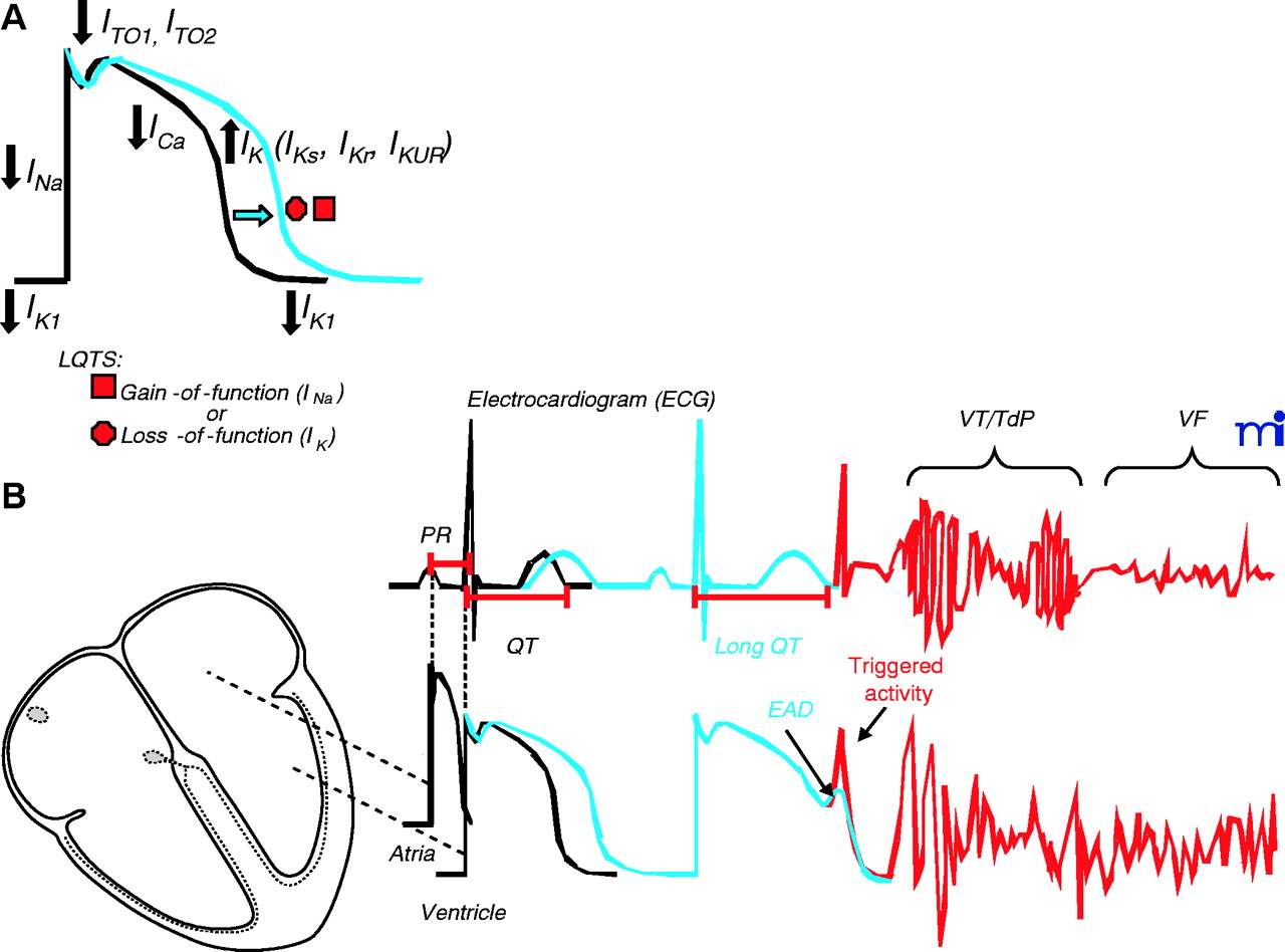 Cardiac action potential, electrocardiogram (ECG), and long QT syndrome (LQTS). A. In LQTS, mutations cause either a gain- or a loss-of-function in INa or IK currents, respectively, that results in prolongation of the cardiac action potential. B. Representative ECG traces in relation to normal atrial and ventricular action potentials. PR and QT intervals, respectively, correspond to the atrial and ventricular activation and repolarization times. Prolongation of the cardiac action potential is reflected as lengthening of the QT interval (blue), an increased vulnerability for the development of early afterdepolarization (EAD), “triggered activity,” and ultimately cardiac arrhythmias [torsade de pointes (TdP) or ventricular fibrillation (VF)]. IKr, rapidly activating delayed-rectifier potassium channel current; IKUR, ultrarapid delayed rectifier potassium current; ITO, transient outward potassium channel current; IK1, inward rectifier potassium channel current.