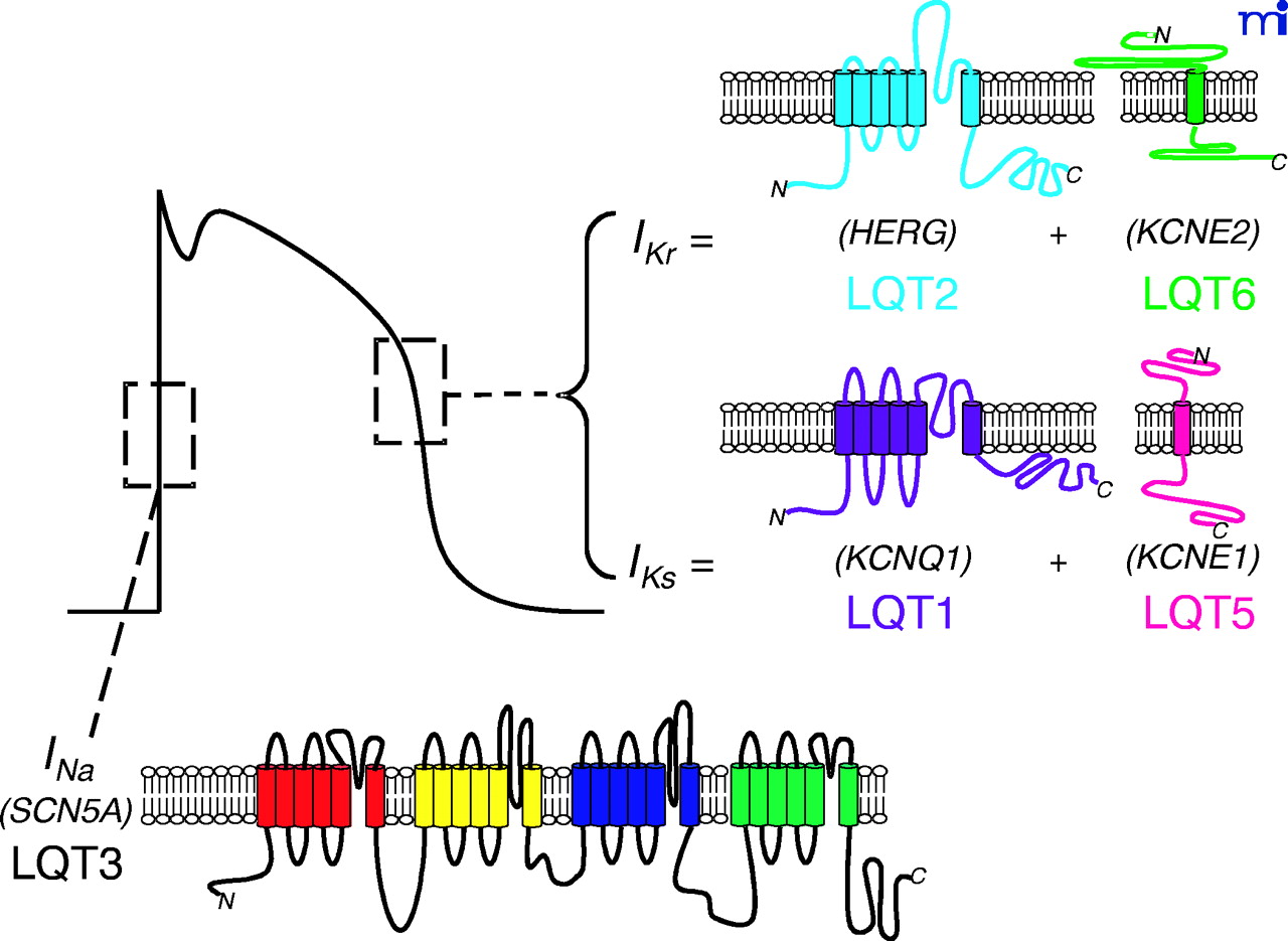 Cardiac ion channel subunits involved in LQTS. Topological maps of the voltage-gated α-subunit for INa (SCN5A) and α/β-subunits that make up IKr (HERG–KCNE2) and IKs (KCNQ1–KCNE1) are shown in relation to a typical ventricular action potential. Genetic mutations in these subunits are responsible for types 1, 2, 3, 5, and 6 of LQTS.