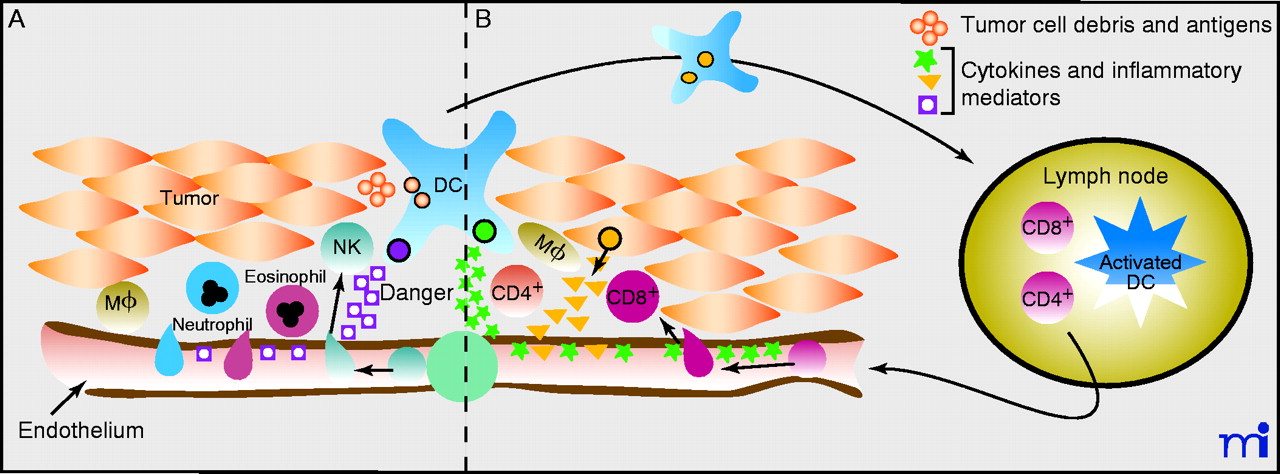 A revised model of cancer immune surveillance. The initial event in priming the immune system to cellular transformation likely consists of a specific danger/alert signature caused by cellular transformation in the context of its surrounding tissue microenvironment. This signature change in the microenvironment may manifest itself as alterations in regulatory cytokines and chemokines produced by tissue cells, the leukocytes with the tissue, and the endothelium supplying nutrients to the tissue. The subsequent immune response to this signature will depend upon the nature of the host cell transformed and transformation process itself. This resulting immune response may be entirely innate (A) or additionally involve components of the adaptive immune response (B). Tissue dendritic cells will likely be central to either type of basic response by virtue of their ability to capture antigen, receive signals through their pattern recognition receptors, and commence crosstalk with other cells in the tissue. Innate responses may include the recruitment of various leukocytes including NK cells, macrophages, and granulocytes (i.e., neutrophils and eosinophils). These events may be sufficiently amplified to control transformation and eliminate the tumor mass by immunological and non-immunological (e.g., vasculature) mechanisms. In other instances, and by as yet undefined molecular cues, dendritic cells within the transformed tissue will be activated and migrate to draining lymph nodes where they will provoke responsiveness of the adaptive immune system including CD4+ and CD8+ T cells. Activated T cells specific for tumor then make their way along a chemokine gradient to the site of tumor growth where they engage in MHC-restricted elimination of tumor cells.