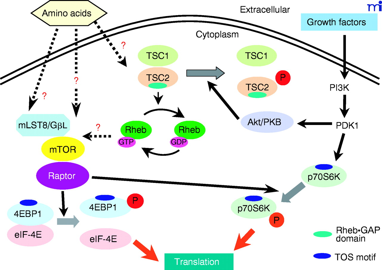 A working model for the mTOR signaling pathways in mammals. Nutrients regulate mTOR signaling pathway and Raptor and mLST8/GβL are components of the mTOR signaling complex. Raptor serves as a scaffolding protein that binds p70S6 kinase (p70S6K) and eukaryotic initiation factor 4E-binding protein 1 (4E-BP1) through their TOR-signaling (TOS) motifs and Raptor facilitates their phosphorylation by mTOR. mLST8/GβL is another component of the mTOR signaling complex. mLST8/GβL interacts constitutively with the kinase domain of mTOR. The right side of the figure outlines a tentative pathway that links growth factor–dependent Akt/PKB activation through phosphatidylinositol-3’ kinase (PI3K) and phosphoinositide-dependent kinase 1 (PDK1) to the stimulation of mTOR-dependent responses. The tuberous sclerosis complex (TSC) proteins TSC1 and TSC2 serve as negative modulators of the mTOR pathway. The small GTPase Rheb (Ras homolog enriched in brain) is a direct target of TSC2’s intrinsic GTPase-activating function. Rheb•GTP appears to be a positive modulator of mTOR signaling. PKB, protein kinase B.