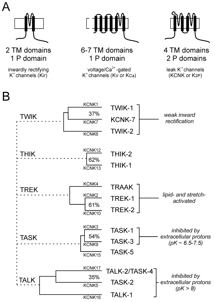 Potassium ion channel gene families. A. Three major K+ channel gene families have been identified: Voltage-gated (Kv) channels have six (or seven) transmembrane segments and one pore domain; inwardly rectifying (Kir) channels present two membrane spanning regions and one pore domain. These channels form as tetramers. The newly identified, weakly rectifying (KCNK) channels are predicted to have four transmembrane regions and two pore domains, each one resembling two Kir channels arranged in tandem. KCNK channels are believed to form as dimers. B. The fourteen known human two-pore-domain K+ channel genes are presented in a phylogenetic tree, and placed into five sub-groups as described (11, 12). Multiple naming schemes for these channels are in current use; however, only two are shown. The Human Genome Organization uses the KCNK designation preceding a number that reflects the order of discovery of each of the genes (as shown here). The International Union of Pharmacology (IUP) adopted a very similar scheme, but replaced the KCNK with a K2P prefix (not shown); the IUP group suggests that a different nomenclature linking clearly related channels will likely be forthcoming (97). One such alternative naming scheme that is in popular use employs a set of acronyms based on salient physiological or pharmacological properties (provided here). TWIK, tandem of P domains in a weak inwardly rectifying K+ channel; THIK, Tandem pore domain halothane-inhibited K+ channel; TREK, TWIK-related K+ channel gene; TRAAK, TWIK-related arachidonic acid-stimulated K+ channel; TASK; TWIK-related acid-sensitive K+ channel; TALK, TWIK-related alkaline pH activated K+ channel.