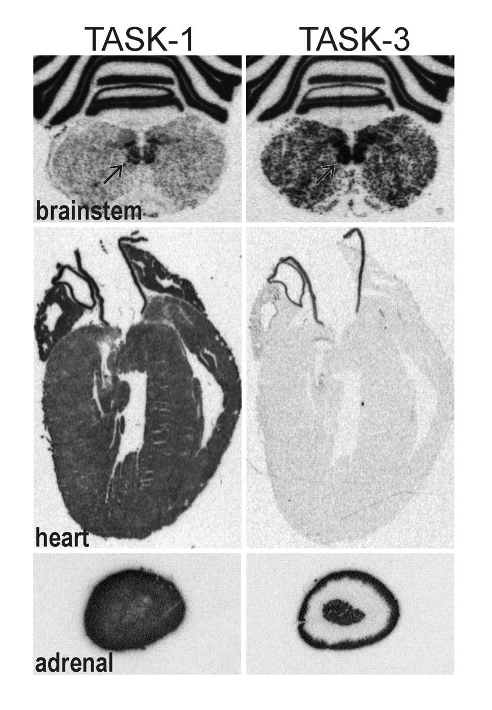 Expression of TASK-1 and TASK-3 channels in rat brainstem, heart and adrenal gland. Sections of rat brainstem (upper), heart (middle), and adrenal gland (lower) were hybridized with [33P]-labeled cRNA antisense probes complementary to TASK-1 (left) and TASK-3 (right). High levels of TASK-1 and especially TASK-3 mRNA in hypoglossal motoneurons in rat brainstem are observed (arrows). In the rat heart, TASK-1 (but not TASK-3) is predominantly expressed. In the adrenal gland (bottom), TASK-1 transcripts are evident in all regions whereas TASK-3 transcripts are expressed at high levels in the outermost layers (zona glomerulosa and fasciculata) and in the adrenal medulla.