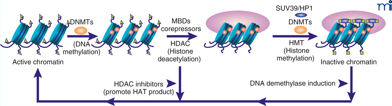 Chromatin remodeling processes. The cartoon depicts changes that occur as chromatin is remodled from active chromatin inactive chromatin. The transition is a multi-step process that involves: a) DNA methylation by DNA methyltransferases (DNMTs); b) binding of methyl CpG dinucleotides by MBD proteins; c) histone deacetylation by HDACs; d) HMTs (e.g., SUV39) that methylate histones and that are recruited by sequence-specific DNA binding proteins (e.g., HP1). HDAC inhibitors can reactivate gene transcription by increasing histone tail acetylation, which relaxes chromatin. The DNA demethylase activity of MBD2 may be involved in reversing the methylation of promoter regions, a first step in reversing gene silencing. MBD, methyl binding domain proteins; HDAC, histone deacetylase; HMT, histone methyltransferase; HP1, heterochromatin binding protein; DNMT, DNA methyl transferase. Green triangles represent the acetylation of histone tails. Green boxes represent the methylation of histones. Figure is modified from (33).