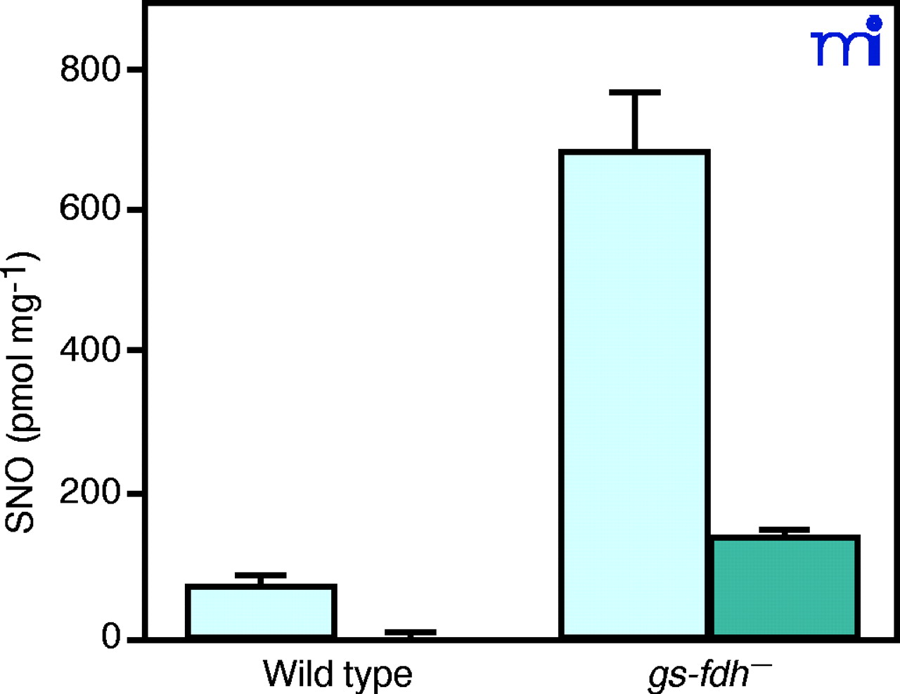 Increased levels of intracellular S-nitrosothiols in gs-fdh— mutant cells after GSNO treatment. Mid-log phase (absorbance 600 nm = 0.4–0.6) cells were cultured in the presence of 5 mM GSNO at 30°C for 2 h. SNO signal in the whole lysate (light blue bars) and the fraction that passed through a 5K cut-off membrane (dark blue bars) were normalized against whole cell lysate protein content. Reprinted with permission (30).