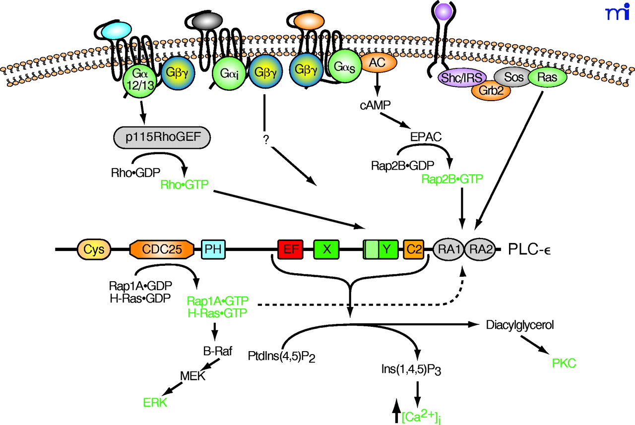 PLC-ε : A nexus for heterotrimeric and small G protein signaling pathways. Phospholipase C activity of PLC-ε is stimulated by Gα12/13, Gβγ, and activated members of Ras and Rho small GTPases to yield downstream second messengers Ins(1,4,5)P3 and diacylglycerol. In addition, ERK signaling pathways are propagated as a result of the guanine nucleotide exchange activity of the PLC-ε CDC25 domain. A positive feedback loop is schematized in which CDC25-promoted activation of H-Ras and/or Rap1A in turn activates the lipase activity of PLC-ε upon binding the C-terminal RA domains (dashed line). See text for details. (AC, adenylyl cyclase; Shc, SH2 domain–containing adaptor protein; IRS, insulin receptor substrate; Grb2, growth factor receptor–bound protein 2; Sos, son of sevenless GEF; MEK, mitogen-activated protein kinase kinase.)