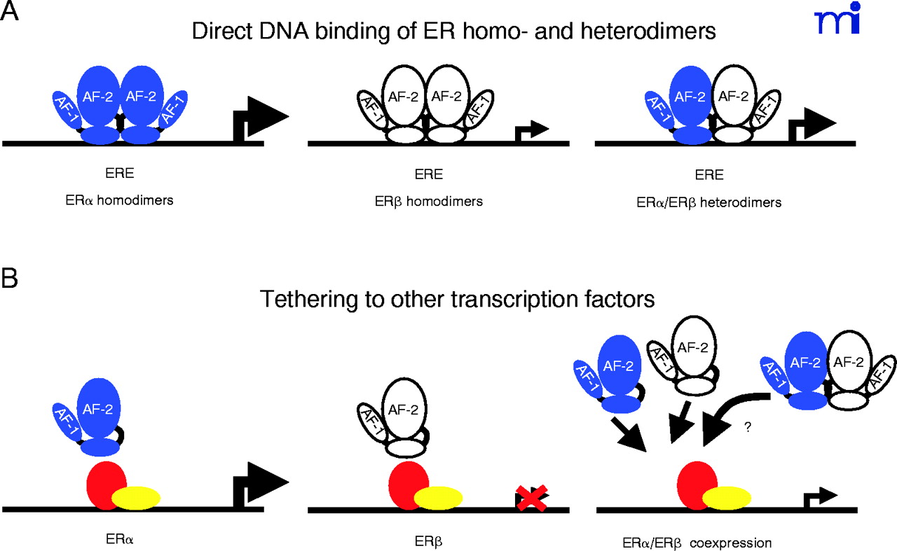 Alternative estrogen-dependent transcriptional regulation by ERα –ERβ homo- and heterodimers. The different modes of direct DNA binding of ER subtypes either as homo- or heterodimers to estrogen response elements (EREs) (A). Representation of the transcriptional regulation by ER subtypes through tethering to other transcription factors, such as activating protein 1 (AP-1) and stimulating protein 1 (Sp1) (B). The relative estrogen-dependent transcriptional activities are represented by the magnitude of the arrow. ERα and ERβ are represented in blue and white, respectively.