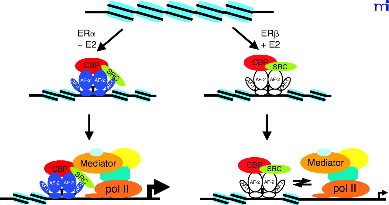 The influence of chromatin on the transcriptional activities of ERα and ERβ. Both ER subtypes exhibit comparable activity on naked DNA, but differential activity on chromatin templates. ERα strongly activates transcription on chromatin templates, whereas chromatin structure is very restrictive for transcription mediated by ERβ. These differences may be due to the inability of ERβ to recruit a stable preinitiation complex to chromatin templates, demonstrating that chromatin represents an important regulatory aspect of ER-mediated gene expression.