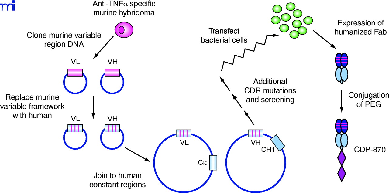 Derivation of CDP870 from a murine TNFα -specific MAb using recombinant DNA technology and protein engineering. The cloned murine variable light and heavy chain cDNAs are modified to insert human framework sequences, and thus only the CDR sequences remain from the original mouse monoclonal antibody. Because this may reduce affinity for the original antigen, additional site-specific mutations may be necessary within the CDR sequences. Because the native Fab is typicall not glycosylated, CDP-870 can be expressed in bocterial cells; PEG is conjugted to the purified humanized molecule.