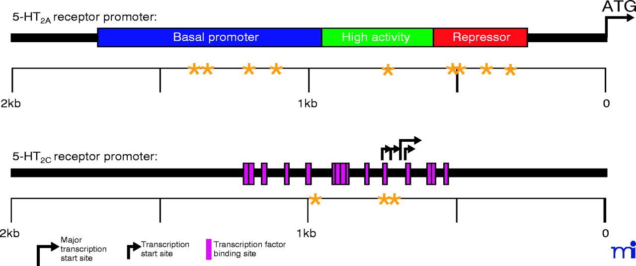 Distribution of promoter SNPs and functional map of regulatory regions for the 5-HT2A/2C receptor genes. Asterisks indicate the location of SNPs within the promoter. SNPs occur within all known regulatory regions and may interfere