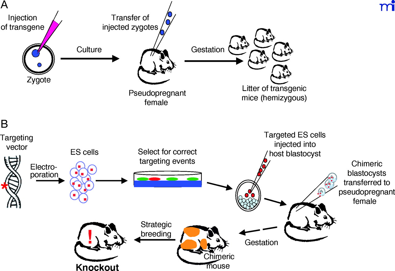 Transgenesis and gene knockout. A. Transgenesis is schematized as a process in which “foreign” DNA is injected into the pronucleus of a fertilized egg, which is then transferred to a pseudopregnant female. The resulting pups may contain one or more copies of the injected transgene, at an untargeted site (or sites) within the genome. B . A gene “knockout” is the deletion of a specific gene (or a whole family of genes) from a functional genome, so that the effect of gene deletion can be correlated to changes in drug metabolism, toxic responses, or susceptibility to carcinogenesis. At the present time, the technology for performing gene knockouts using embryonic stem (ES) cells is routinely available only for the mouse; however, in the near future, it is likely that other species, such as the rat, will also be amenable to this technology. In addition, it is possible to exchange genes by homologous recombination; for example, by deleting a particular gene or transcription factor and simultaneously substituting it with the same gene from another species. The organism produced by such a substitution (i.e., containing a transgene in place of an endogenous gene) is referred to as a “knockin” animal.