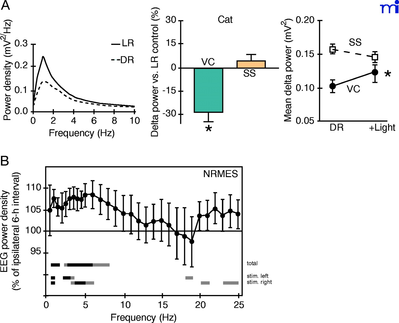 Sensory experience affects quality of subsequent sleep. A. Early sensory deprivation reduces slow-wave activity. (Left) Representative SWS power spectra of light-reared (LR) and dark-reared (DR) cats. DR kittens were raised in complete darkness from birth for 4 months. (Center) Group data. Reduction of delta power after DR is restricted to visual cortex (VC) and not seen in somatosensory area (SS). (Right) Slow-wave plasticity is reversible. Recovery of delta activity after light re-exposure for one to two months. Adapted from Miyamoto et al. (53). B. Sensory stimulation during waking enhances interhemispheric asymmetry of EEG power density. Ordinate indicates EEG power density of hemisphere contralateral to intact whisker side as a percentage of ipsilateral hemisphere (whisker-cut side) during SWS. Lines above the abscissa indicate significant difference between hemispheres. Top line (total) represents statistics for all data, middle and bottom lines for stimulation of intact left or right side whiskers. Adapted from Vyazovski et al. (54).