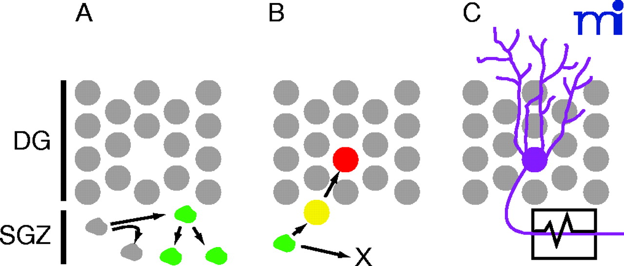 Process of neurogenesis. Neurogenesis in the adult hippocampus is a process that includes progression from cell proliferation through lineage commitment and functional integration. A. Self-renewal and Proliferation Phase. Resident neural stem cells in the subgranular zone (SGZ) below the hippocampal dentate gyrus (DG) occasionally undergo cell cycle, producing progeny that either retain their stem cell-like nature (self-renewal) or begin a process of lineage commitment as neural progenitor cells (green). The progenitor cells act as a reserve of cells that can be expanded under the influence of environment factors, such as antidepressants. B. Survival and Differentiation Phase. Under appropriate environmental conditions, some progenitor cells (green) progress in their lineage commitment (yellow) and move into the granule cell layer where they begin to express markers characteristic of mature neurons (red). This represents the process of differentiation into neurons. Other progenitor cells may commit to become astrocytes or die (X). This process is typically complete within one or two weeks from the progenitor cell’s “birthdate” when it exits from cell cycle. C. Maturation and Functional Integration Phase. Newly generated neurons eventually establish a morphology consistent with neuronal function such as the elaboration of a dendritic arbor, formation of dendritic spines and synapses, axonal extension, and the ability to conduct action potentials.