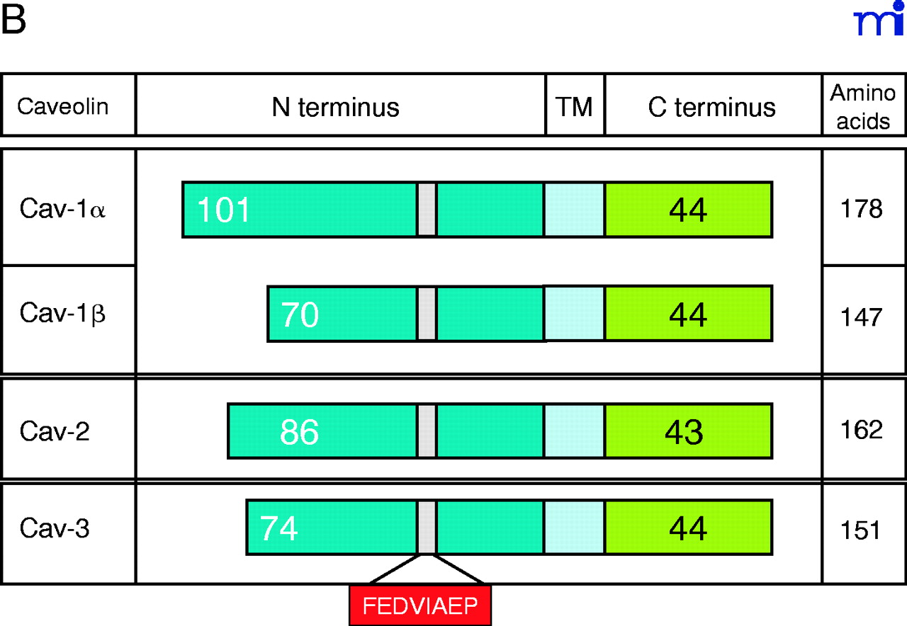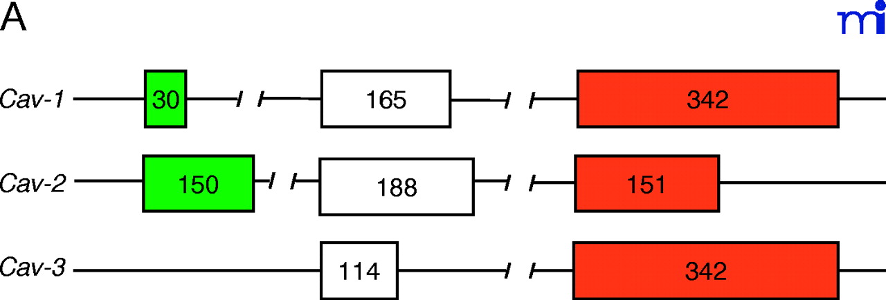 The caveolin gene family. A. The exon arrangement in Cav-1, Cav-2, and Cav-3 is indicated by boxes; the number of nucleotides in each exon is shown. B. The three caveolin proteins (Cav-1, Cav-2, and Cav-3), including the two isoforms of Cav-1, can be depicted in terms of N-terminal, transmembrane (TM), and C-terminal domains. The position of the conserved FEDVIAEP signature motif is illustrated.