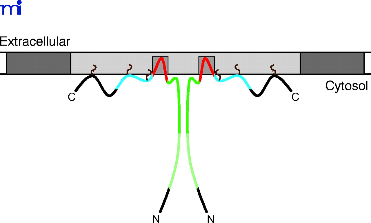 Topology of caveolin at the inner cell membrane. A dimer of Cav-1 is represented; interprotomeric association is maintained through the so-called oligomerization domain (dark and light green). Association of Cav-1 with the cell membrane is maintained by N-terminal and C-terminal membrane attachment domains (dark green and blue, respectively), the transmembrane domain (red), and three palmitoyl groups (brown). The plasma membrane is indicated in dark gray; cholesterol- and sphingomyelin-enriched membrane is indicated in light gray.
