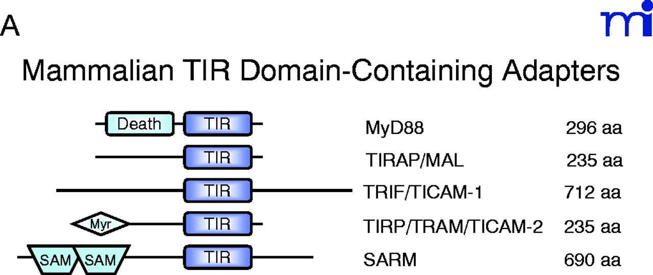 Schematic representation of known mammalian TLR adapter molecules. A. MyD88, TIRAP/Mal, TRIF/TICAM-1, and TIRP/TRAM/TICAM-2 are all known TLR adapter proteins, while the function of SARM is not yet known. B. CLUSTAL W alignment of the TIR domains of human and mouse MyD88, TIRAP/Mal, TRIF/TICAM-1, and TIRP/TRAM/TICAM-2. The amino acid colors are based on their physicochemical properties where yellow = small, green = hydrophobic, turquoise = aromatic, blue = positively charged and red = negatively charged. The three important regions, Box 1, 2, and 3 are labeled.