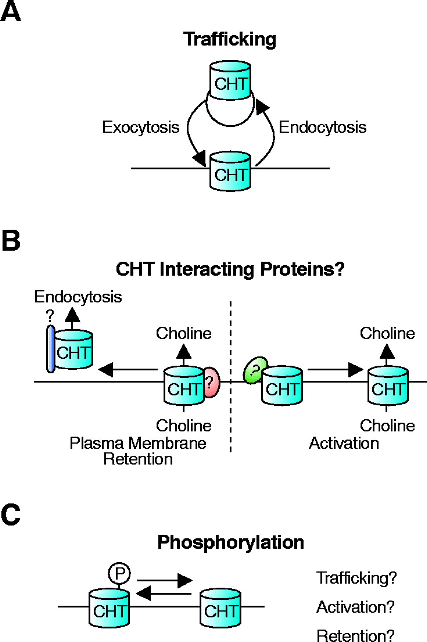 Potential mechanisms for the regulation of CHT function. Each of these mechanisms represents a candidate target for the pharmacological enhancement of CHT function. (A) A trafficking component is supported by the large cytoplasmic reserve of CHT on cholinergic synaptic vesicles that could serve to couple choline uptake capacity to the rate of ACh release (66). CHT abundance at the plasma membrane will reflect the balance between CHT exocytosis and endocytosis. (B) There are many possible ways to regulate CHT through interacting proteins. Different binding partners could either retain CHT at the plasma membrane or lead to CHT’s recruitment into clathrin-coated pits for endocytosis. Alternatively, the activity of CHTs within the plasma membrane could be regulated by interactions between CHT and other as yet unidentified proteins. (C) In conjunction with trafficking mechanisms and protein–protein interactions for controlling CHT function, posttranslational modification of the transporter could also serve control presynaptic choline uptake. The CHT phosphorylation state could directly regulate transport activity but might also determine the affinity of interactions between CHT and various regulatory or trafficking proteins.