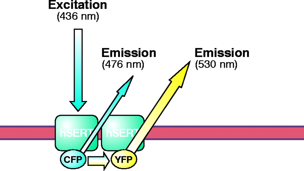 FRET methodology. Fluorescence resonance energy transfer (FRET) is a quantum physical phenomenon that occurs only if two fluorophores are in sufficiently close proximity (<100 Å) and in an appropriate relative orientation. When these two criteria are met, an excited fluorophore (donor) can transfer its energy to a second, longer-wavelength fluorophore (acceptor) in a non-radiative manner. Among the spectral variants of the green fluorescent protein (GFP), the cyan and yellow fluorescent proteins (CFP and YFP) enjoy widespread use. The figure shows these fluorescent proteins fused to the N terminus of SERT. Enhancement of the acceptor (YFP) emission results from transfer of energy from the donor molecule (CFP); the donor emission diminishes concomitantly. In this case, the energy transfer is indicative of physical association of two (or more) SERT molecules in the plasma membrane.