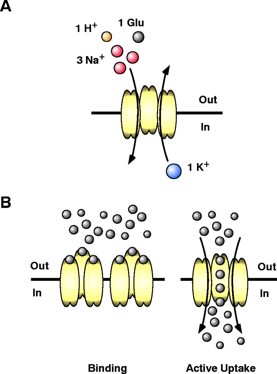 Transport through glutamate transporters. (A) Glutamate transporters use the Na+, H+, and K+ electrochemical gradients to drive the intracellular accumulation of glutamate into neurons and glial cells. Glutamate uptake is an electrogenic process that requires the inward movement of three Na+, one H+, and one molecule of glutamate coupled with the counter transport of one K+. (B) Glutamate transporters may reduce the amount of synaptic glutamate by two distinct mechanisms. The first mechanism involves glutamate binding that effectively buffers the amount glutamate available for receptor activation. Although this mechanism can be extremely fast, there needs to be a high density of transporters near glutamate release sites on astrocytes or neurons for this mechanism to be effective. The second mechanism involves active uptake. The cycle time for these transporters is estimated to be between 20 and 100 msec; therefore this process is slow compared to some of the very fast excitatory signals that can be a few msec in duration. However, under periods of sustained release or when the receptor signaling is relatively slow, active uptake can shape excitatory activity.