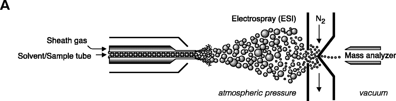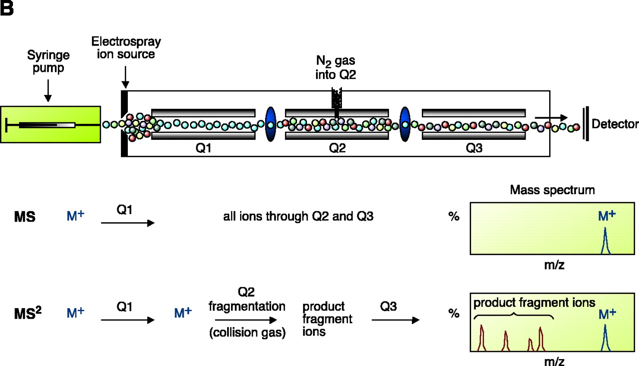 Electrospray ionization and triple quadrupole mass spectrometer. ESI-MS is unsurpassed for complete analysis of phospholipid mixtures. It has been successfully used for quantitative measurements of phospholipids from biological samples (40–43). The “soft” electrospray ionization causes little or no fragmentation and hence virtually all phospholipid species can be detected as molecular ion species (denoted as M*), when analyzed in a single-stage mode using either Q1 or Q3 quadrupoles operating as mass analyzers. The choice of polarity is determined by the possible charge state of the phospholipid class in solution. All zwitterionic phospholipids (PC, LPC, SM, and PE) can ionize in both positive and negative ion modes. With the exception of PE, they are more efficiently analyzed in positive mode. Because of their negative charge at neutral pH, anionic phospholipids (PI, PA, PG, and PS) produce primarily [M-H]- (deprotonated molecule retaining a negative charge) as the molecular ion peak and are easily detected in negative ion mode. Thus, two sets of mass spectra are obtained for each sample—one in positive and one in negative ionization mode, with all detected phospholipid species presented as peaks at their specific m/z value. The identification and structural information about a particular peak is acquired by tandem MS (44, 45). The relevant ion is subjected to collision-induced dissociation (CID) by interaction with a collision gas. A fragmentation spectrum (product, or “daughter” spectrum) is generated as a result, revealing structural information (acyl chain or head group chemistry, depending on the ionization mode). On that basis, “fragmentation libraries” can be created for the phospholipid species composition of any cell type (38).