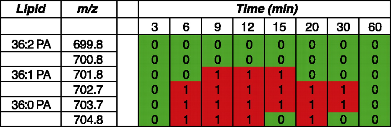 Excerpt of a lipid array displaying peaks in them/z range of 699.8 to 704.8 at 8 time points. Analysis using CID MS/MS determined that this area contains phosphatidic acid (PA) species with 36 carbons and three different double-bond configurations. Two of the species are increasing in intensity at several of the time points between 6 and 30 minutes following stimulation of B6A4C1 mast cells with the calcium ionophore A23187.