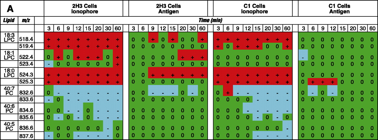 Lipidomics multiplexed analysis. Changes in individual molecular species of membrane phospholipids are shown from 2x105 cell equivalents of lipid extract from RBL-2H3 and mutant RBL mastocytoma cells (B6A4C1) for comparison. Phospholipids were extracted using the Bligh/Dyer extraction procedure under acidic conditions (46). The chloroform phase of the extraction, containing most of the phospholipids, was carefully removed and the solvent was evaporated. The resulting lipid film was immediately dissolved in CH3OH:CHCl3 (9:1), containing 1% NH4OH to facilitate protonation, and analyzed by mass spectrometry. Mass spectra were acquired on a Bruker Esquire-LC 00146 ion trap mass spectrometer (Bruker Daltonics, Billerica, MA) equipped with an ESI interface. All samples were sprayed in positive and negative mode, resulting in a variety of molecular ion signals in the range of m/z 500–1000. Excerpts from the generated positive (A) and negative (B) mode lipid arrays are illustrated. Phospholipids are presented with the class abbreviation preceded by xx:y, where xx is the total carbon atoms in the fatty acid chains and y is the number of double bonds. (See text for details.)