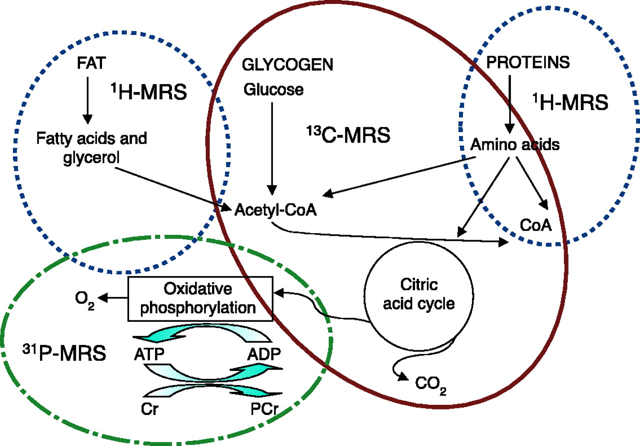 Metabolic pathways amenable to magnetic resonance spectroscopy ( 1 H-, 13 C-, and 31 P-MRS).