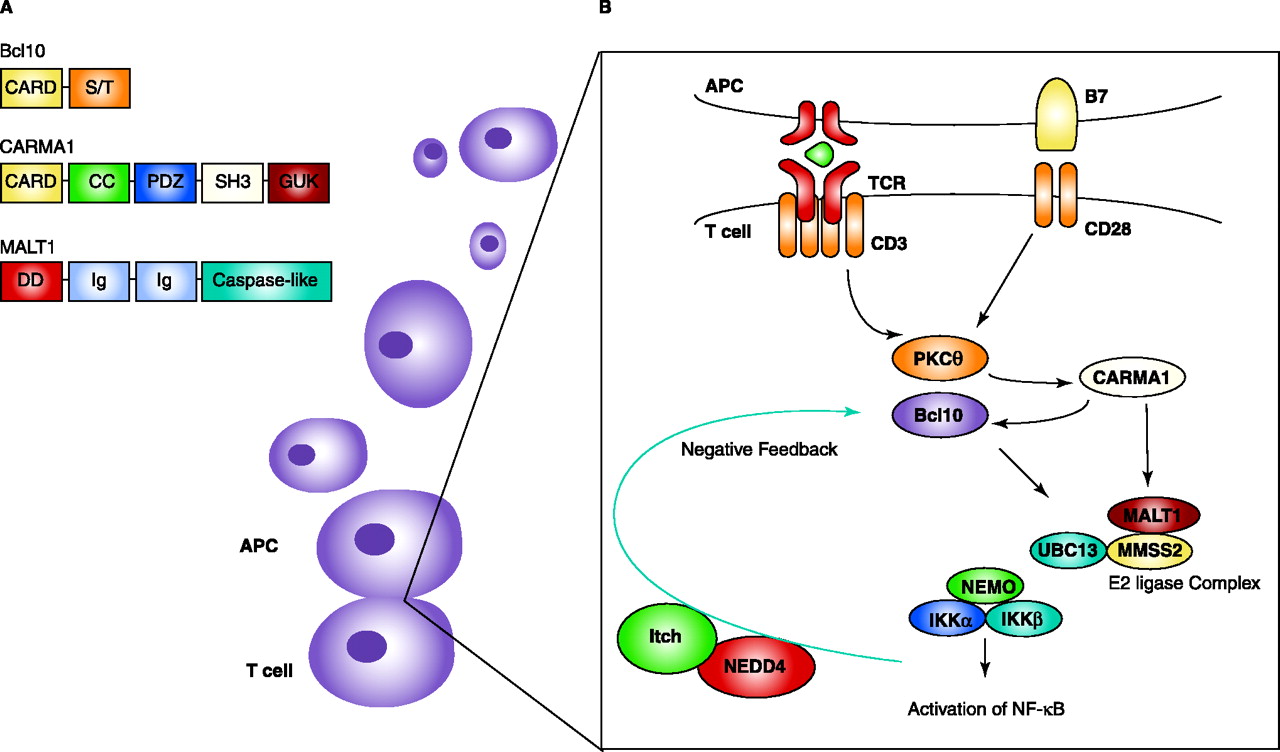 Mapping NF-κB activation in T cells. A. Domain structure of Bcl10, CARMA1, and MALT1. Domains within each protein may promote homo-oligomerization and multiprotein complex formation. CARD, caspase recruitment domain; S/T, serine-threonine-rich domain; CC, coiled-coil domain; PDZ, postsynaptic density 95, discs large, and zona occludens-1 domain; SH3, Src homology 3 domain; GUK, guanylate kinase domain; DD, death domain; Ig, immunoglobulinlike repeats; caspase-like, a domain very similar to those found in caspase proteins. B. Upon TCR activation, CARMA1 interacts with Bcl10 at the immunological synapse via their CARD domains. CARMA1 also recruits PCK??to the lipid rafts at the synapse, which may further aid Bcl10 activation. Through its coiled-coil domain, Malt1 binds CARMA1. Malt1 is, itself, recruited to the rafts. Bcl10 induces the oligomerization of Malt1, allowing for the formation of a ubiquitin-conjugating E2 complex consisting of UBC13 and MMS2. These molecules catalyze K63-linked polyubiquitination of NEMO (leading to its destruction) and the activation of IKK. Ubiquitin ligases NEDD4 and Itch can also negatively regulate this pathway by degrading Bcl10.