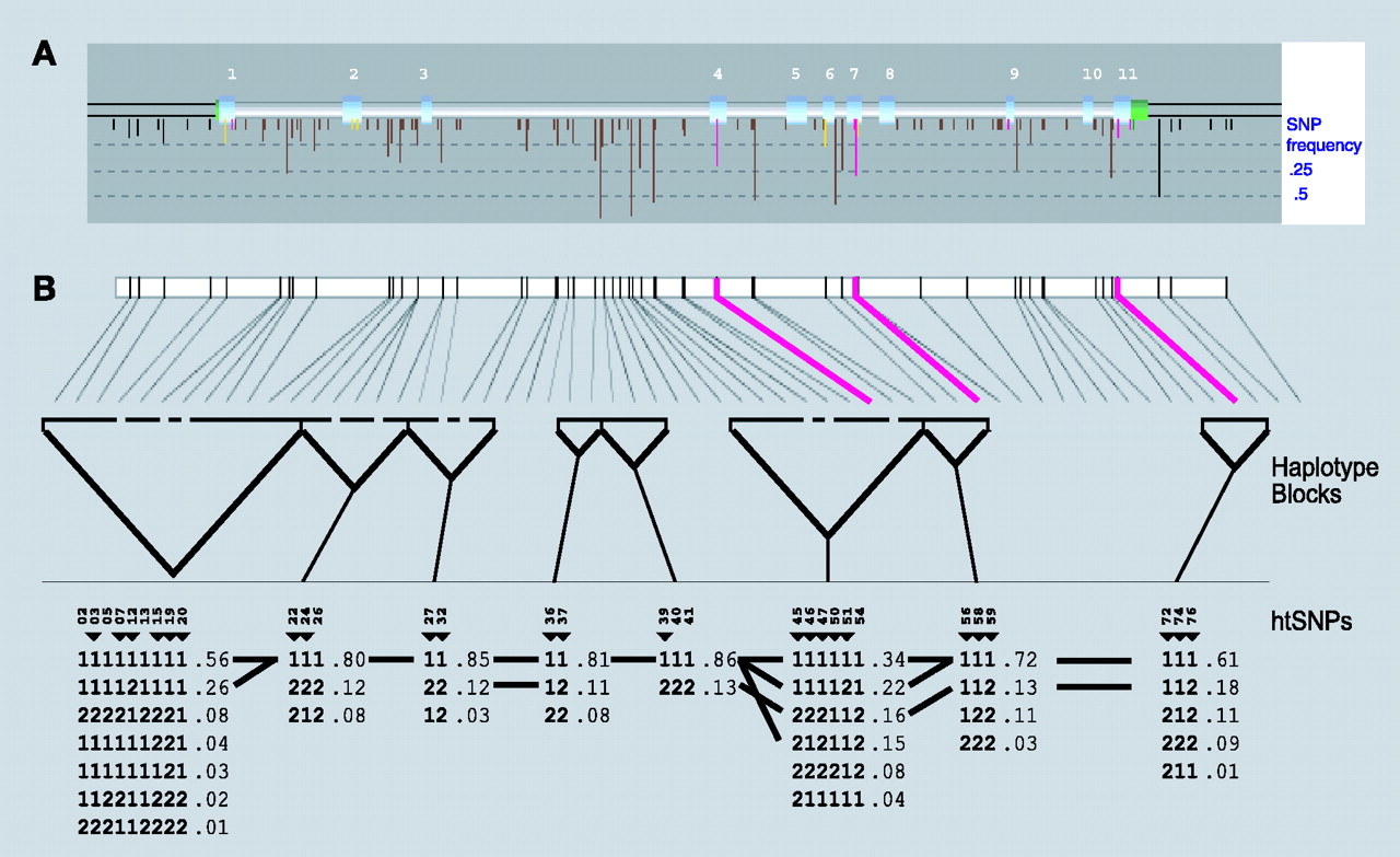 A GeneSNPs view of the methylenetetrahydrofolate reductase (MTHFR) gene. A. The MTHFR-encoding gene represents a typical EGP gene, in terms of size and nucleotide diversity, that has been scanned for polymorphism discovery. MTHFR has eleven exons (light blue indicates protein-coding and green indicates untranslated (UTR) sequences). For this gene, 15 kb was scanned for polymorphisms, which includes sequences 5′ to the first exon (~1.7kb) and 3′ of the last exon (~1.5 kb), by amplifying ninety U.S.-representative DNA samples using nineteen overlapping amplicons. Vertical descending lines represent SNPs identified in this sequence; the length of these vertical lines represents the frequency of the minor allele, and the color indicates whether the SNP location is in flanking (black), intronic (brown), synonymous (yellow), non-synonymous (red), or UTR (green) sequences. B. The structure of haplotype blocks along the MTHFR gene sequence is generated using the default algorithm from Gabriel et al. (31). For this gene, the algorithm partitions the SNPs with minor (>2%) allele frequencies into eight discrete blocks of linkage disequilibrium. Within each haplotype block are indicated the haplotypes, with the major and minor allele represented by a “1” or “2,” respectively. Population frequencies (>1%) are shown next to each haplotype block, and lines show the most common (>10%) recombination events between blocks. Marker numbers are shown across the top, with haplotype-tagging SNPs (htSNPs) highlighted with a triangular pointer.