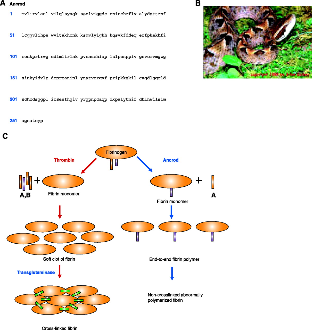 Fibrinogen depletion by the snake venom protein ancrod. A. Ancrod is a 258-amino acid serine protease derived from the Malayan pit viper, Calloselasma (Agkistrodon) rhodostoma (photo provided by Mardi Snipes) (B), with thrombin-like specificity for fibrinogen (142, 143). C. Ancrod cleaves only the fibrinopeptide A without removing fibrinopeptide B, thus resulting in improper fibrin polymer formation. Ancrod-cleaved fibrinogen cannot be crosslinked by Factor XIII (transglutaminase) to form fibrin and, thus, is subsequently degraded and depleted from the circulating blood supply.