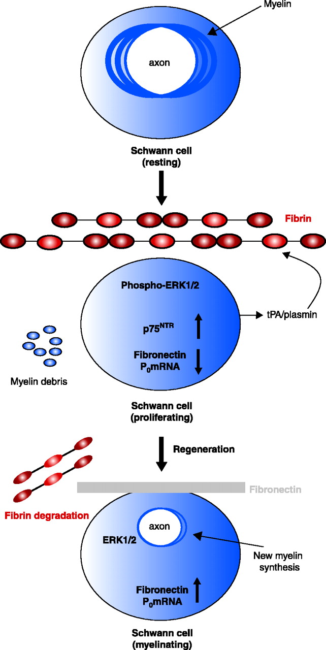 Proposed mechanism for the effects of fibrin in peripheral nerve remyelination. Myelinating Schwann cells in the adult normal sciatic nerve have established axonal contacts and produce myelin that enwraps the axons. After injury, axons degenerate, myelin is degraded, and fibrin is deposited. Fibrin deposition regulates Schwann cell numbers by increasing the phosphorylation of extracellular signal-regulated kinases 1 and 2 (ERK1/2) and by increasing the protein expression of p75 neurotrophin receptor (p75NTR). The combined action of the proliferating ERK1/2 pathway and the p75NTR pathway sustains the Schwann cells in a nonmyelinating state, as evidenced by the shut down of myelin genes transcription [e.g., the myelin protein zero (P0) gene], and decreased amounts of fibronectin transcripts. Downregulation of the P0 or the fibronectin gene could either be due to the increased ERK1/2 phosphorylation as observed in transformed cells (144), and/or by another mechanism. When fibrin is degraded during nerve regeneration, ERK1/2 becomes unphosphorylated, p75NTR levels decrease, fibronectin is produced and deposited in the nerve, and Schwann cells transcribe myelin genes and remyelination is initiated. Up-regulation of P0 associated with downregulation of p75NTR is a characteristic change associated with myelination (145). Reprinted from (66); Neuron, 14, Akassoglou et al. “Fibrin inhibits peripheral nerve remyelination by regulating Schwann cell differentiation,” 861–875, (2002), with permission from Elsevier.