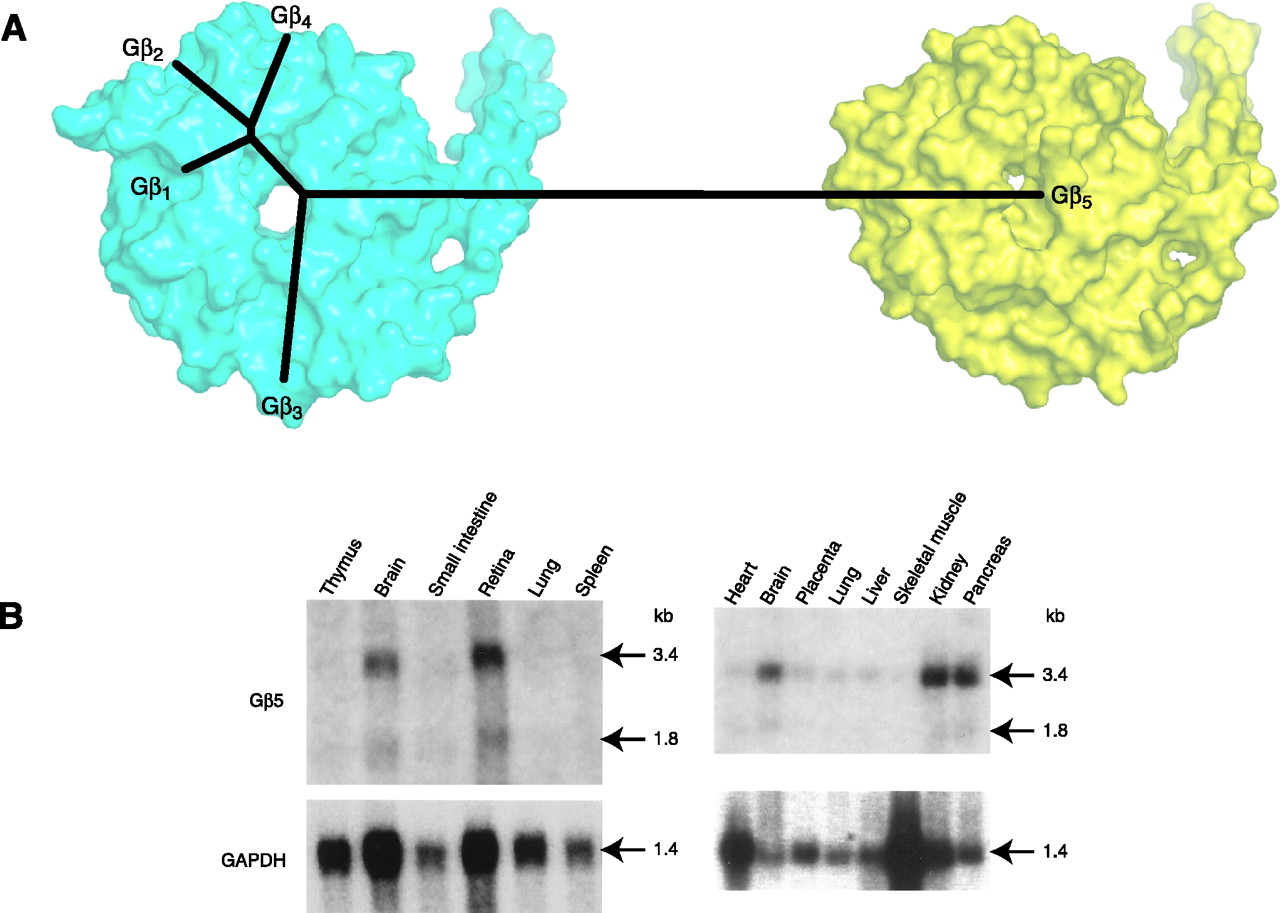 The novel nature of the Gβ5subunit. A. An unrooted dendrogram depicting the relationship among human Gβ subunit protein sequences is superimposed over a space-filling model structure of the Gβ1 subunit (cyan; PDB id 1TBG) and a space-filling model of the Gβ5 subunit (yellow; model coordinates generously provided by Dr. John E. Sondek, UNC-Chapel Hill). B. Northern blot analyses of human Gβ5 transcript expression patterns. Blots of 20 mg total RNA (left) or 2 μg poly(A+) RNA from various human tissues were serially hybridized with a mouse Gβ5 cDNA probe and, as a control for RNA loading and quality, a human glyceraldehyde-3-phosphate dehydrogenase probe. Data adapted from Snow et al. (1998) Proc. Natl Acad. Sci. USA, 95, 13307–13312. Copyright ©1998 by The National Academy of Sciences of the United States of America.