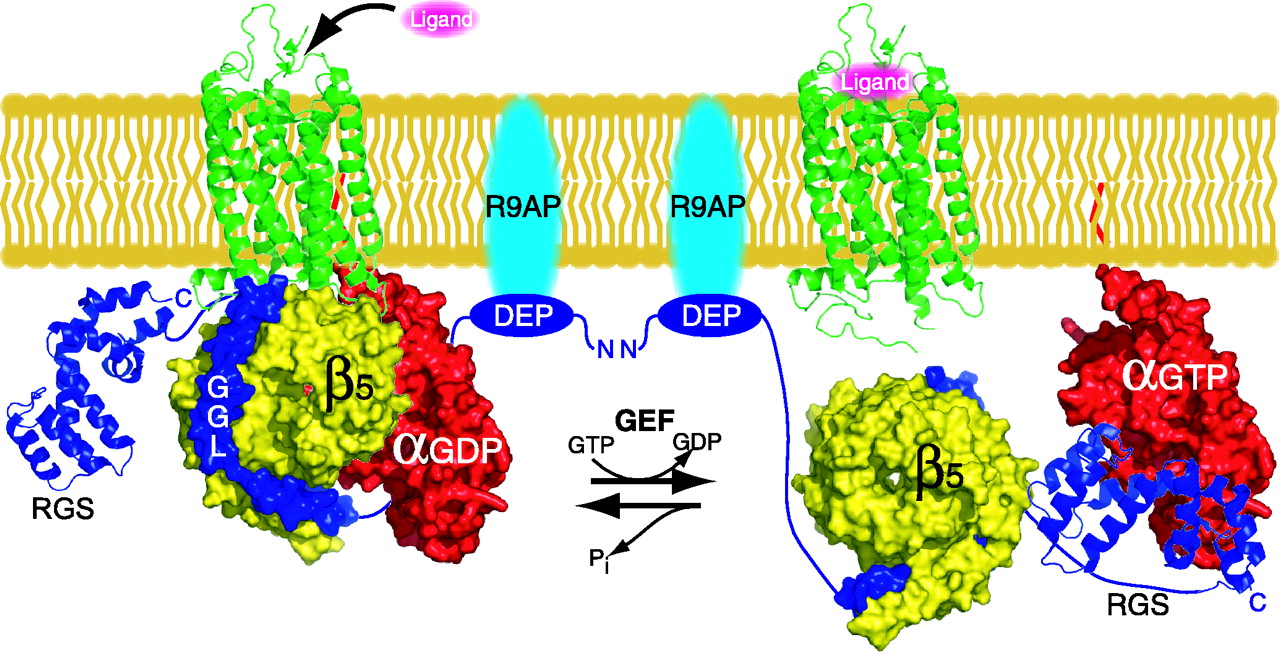 A model depicting a possible Gα–GDP–Gβ5–R7 heterotrimer coupled to a GPCR. GDP-bound Gα would undergo ligand-induced nucleotide exchange when coupled with a Gβ5–R7 dimer. The Gβ5–R7 complex would be tethered to the membrane via binding of R9AP (or an R9AP-like molecule) to the DEP domain of the RGS protein. Upon activation, the RGS domain of the Gβ5–R7 complex would be conveniently localized to accelerate the hydrolysis of GTP to GDP.