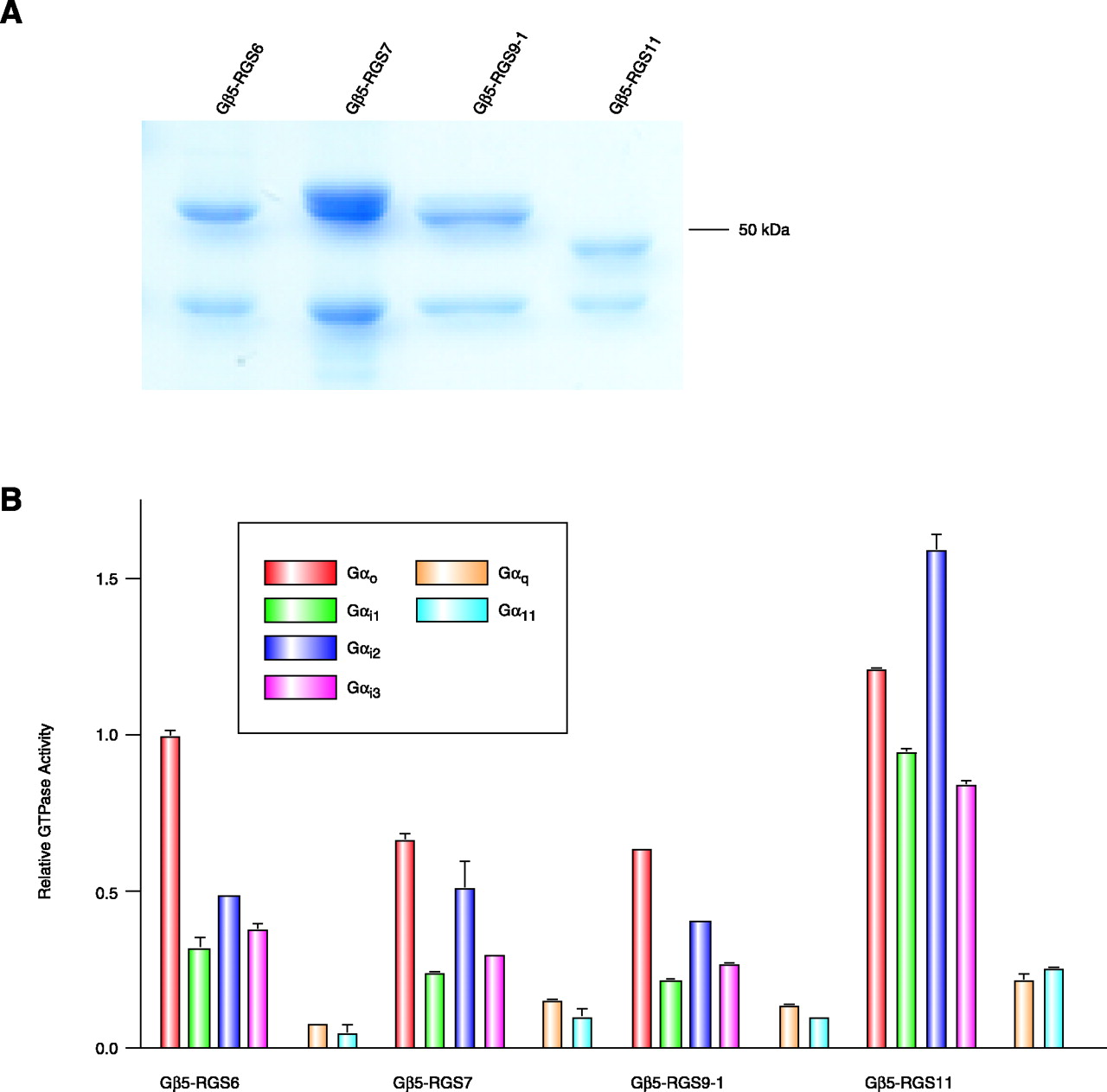 The effects of purified Gβ5–R7 dimers on the GTPase activity of Gi and Gq family Gα subunits. A. Recombinant epitope-tagged Gβ5–R7 dimers were expressed in insect cells and purified; purified products are shown on a coomassie blue-stained SDS-PAGE gel. B. Relative steady-state GTPase activities of various purified Gα subunits reconstituted with receptors in proteoliposomes were determined in the presence of Gβ5–R7 dimers. Gαo, Gαi1, Gαi2, and Gαi3 (with Gβ1γ2) were reconstituted in phospholipid vesicles with the M2 muscarinic receptor, and Gαq and Gα11 (with Gβ1γ2) were reconstituted with the M1 muscarinic receptor (62).