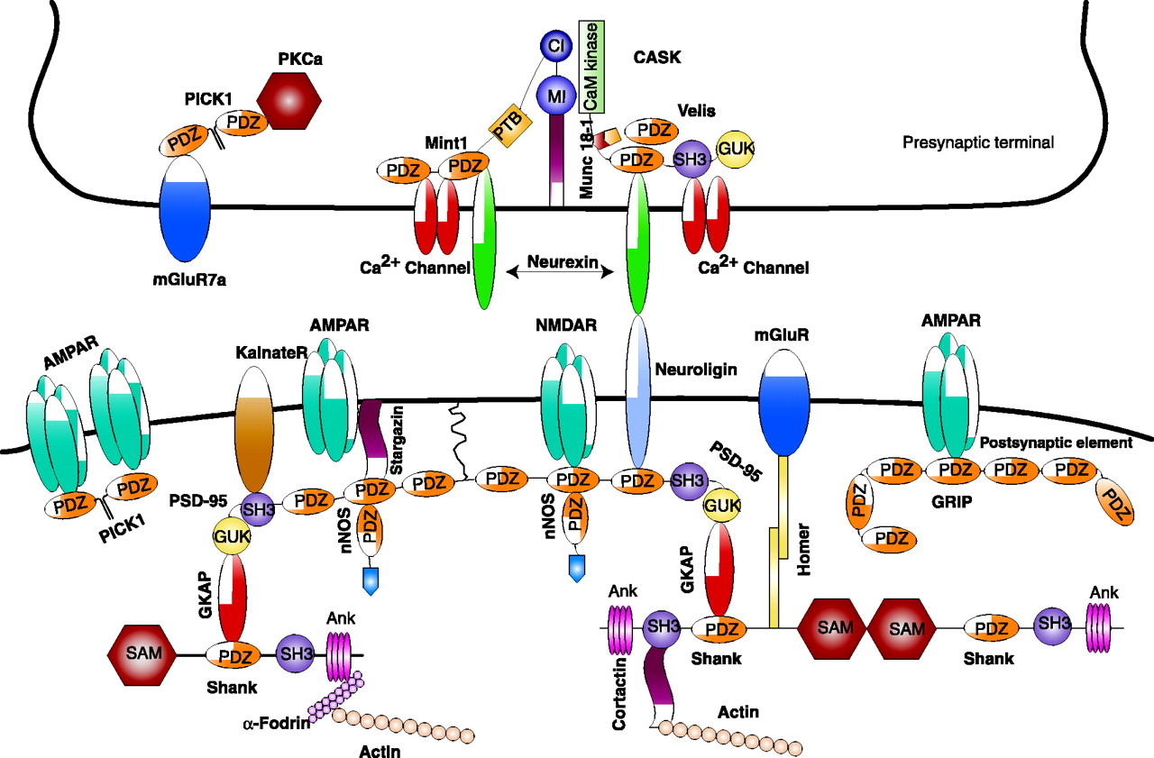 Neuronal PDZ domain–organized macromolecular signaling complexes at the synapse. The intercellular junction is formed by neurexin and neuroligin. On the presynaptic side, CASK interacts with neurexin through its PDZ domain. CASK also interacts with two PDZ domain–containing proteins, Velis and Mint1, and with N-type Ca2+ channels. The PDZ domains of Mint1 bind to N-type Ca2+ channels, and its N-terminus interacts with Munc 18-1 and CASK. In addition, the PDZ domain of PICK1 (protein interacting with C kinase-1) interacts with the C terminus of metabotropic glutamate receptor subunit 7a (mGluR7a) and the catalytic subunit of protein kinase Cα (PKCα). On the postsynaptic side, the PDZ domains of PSD-95 interact with the PDZ domain of neuronal nitric oxide synthase (nNOS) and with the C-termini of the N-methyl-d-aspartate receptor (NMDAR), neuroligin, and the α-amino-3-hydroxy-5-methyl-4-isoxazolepropionate (AMPA) receptor (AMPAR)- targeting protein stargazin. The Src homology 3 (SH3) domain of PSD-95 binds to kainate receptors (KainateR). PSD-95 is attached to the postsynaptic membrane via the N-terminal palmitate group (wiggly line). The guanylate kinase (GUK) domain of PSD-95 interacts with guanylate kinase domain-associated protein (GKAP), and the C-terminal tail of GKAP directly binds to the PDZ domain of Shank. Shank also couples the metabotropic glutamate receptors (mGluRs) via the bridge protein Homer. Shank can multimerize via its sterile alpha motif (SAM) domain and is directly linked to the cytoskeleton via two actin-binding proteins: cortactin and α-fodrin. The AMPA receptors also bind to two additional PDZ proteins GRIP/ABP (glutamate receptor-interacting protein/AMPA receptor–binding protein) and PICK1 via PDZ domain-mediated protein interactions. MI, Munc 18-1-interaction domain; CI, CASK interaction domain; Ank, ankyrin repeat.