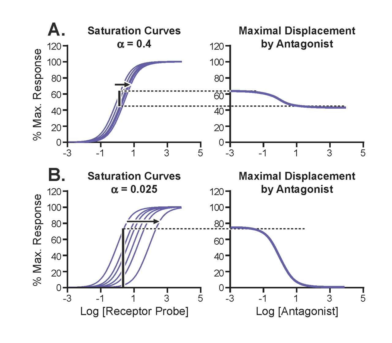 Displacement of radioligand by allosteric antagonists. (A) An allosteric antagonist with α= 0.4 produces a low-magnitude shift to the right of the saturation binding curve; correspondingly, a shallow curve is observed for displacement of 60% maximally bound radioligand. In contrast (B), allosteric antagonists with lower values of α (here, α= 0.025) and orthosteric antagonists produce much larger shifts to the right of the saturation binding curve, resulting in a complete displacement of pre-bound radioligand.